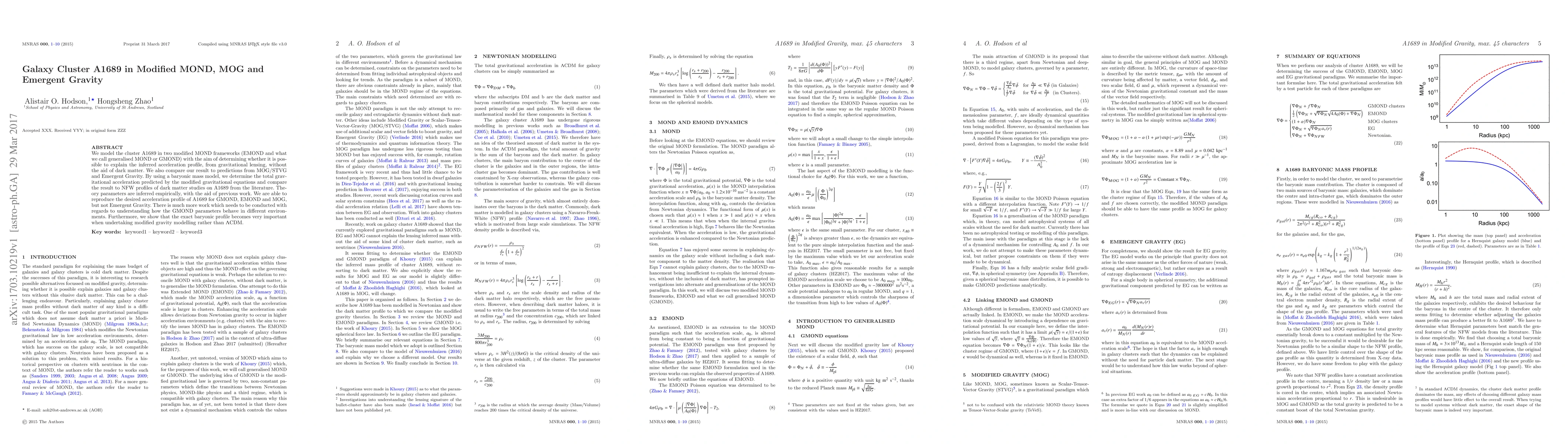 We model the cluster A1689 in two modified MOND frameworks (EMOND and what we call generalised MOND or GMOND) with the aim of determining whether it is possible to explain the inferred acceleration profile, from gravitational lensing, without the aid of dark matter. We also compare our result to predictions from MOG/STVG and Emergent Gravity. By using a baryonic mass model, we determine the total gravitational acceleration predicted by the modified gravitational equations and compare the result to NFW profiles of dark matter studies on A1689 from the literature. Theory parameters are inferred empirically, with the aid of previous work. We are able to reproduce the desired acceleration profile of A1689 for GMOND, EMOND and MOG, but not Emergent Gravity. There is much more work which needs to be conducted with regards to understanding how the GMOND parameters behave in different environments. Furthermore, we show that the exact baryonic profile becomes very important when undertaking modified gravity modelling rather than {\Lambda}CDM.
