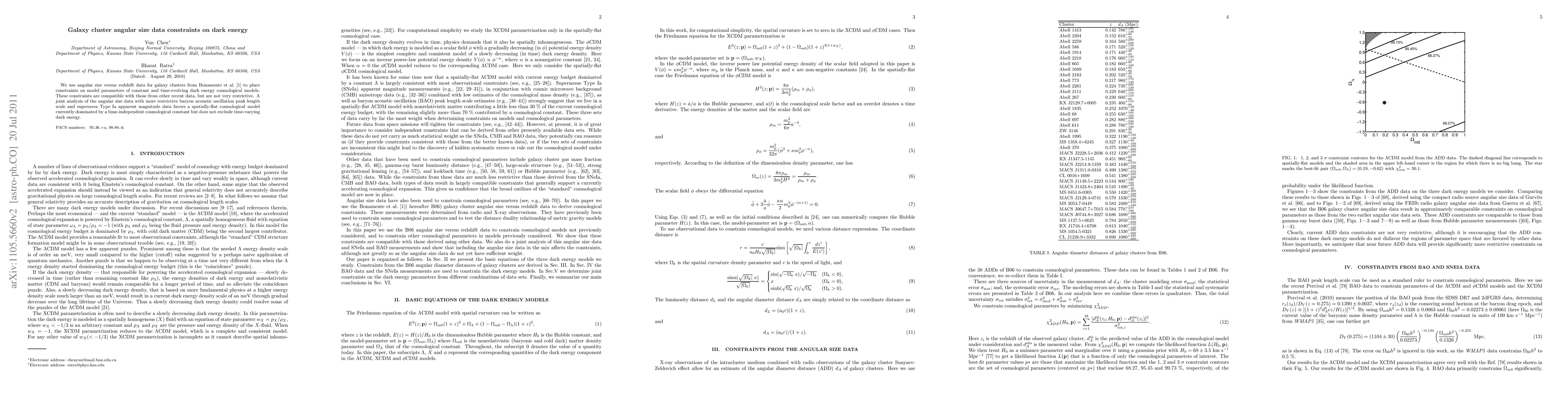 This paper uses galaxy cluster angular size data to constrain dark energy models, finding results compatible with other data but not highly restrictive. A combined analysis with baryon acoustic oscillation and supernova data favors a flat universe dominated by a constant cosmological constant but leaves room for time-varying dark energy.