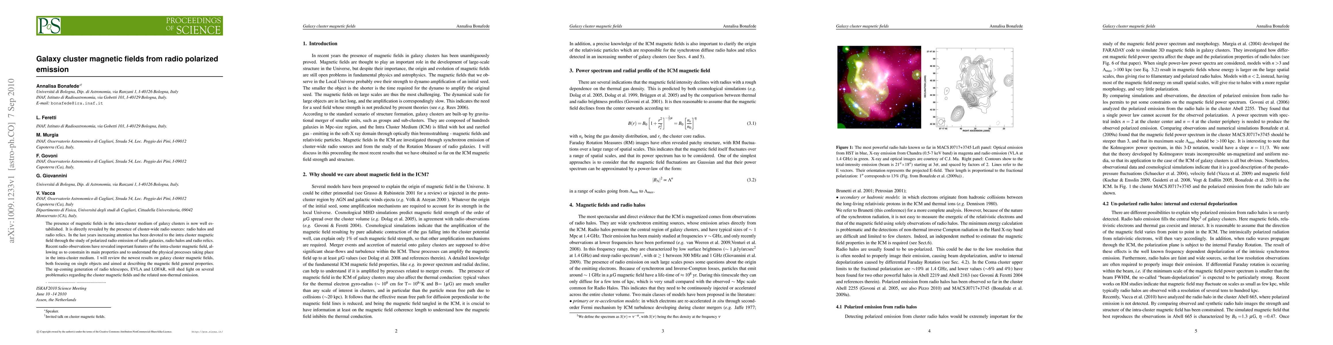 This paper reviews the latest findings on magnetic fields in the intra-cluster medium of galaxy clusters, revealed through polarized radio emissions from radio halos, radio relics, and radio galaxies. The study highlights the potential of upcoming radio telescopes like EVLA and LOFAR to further elucidate these magnetic fields and associated non-thermal processes.