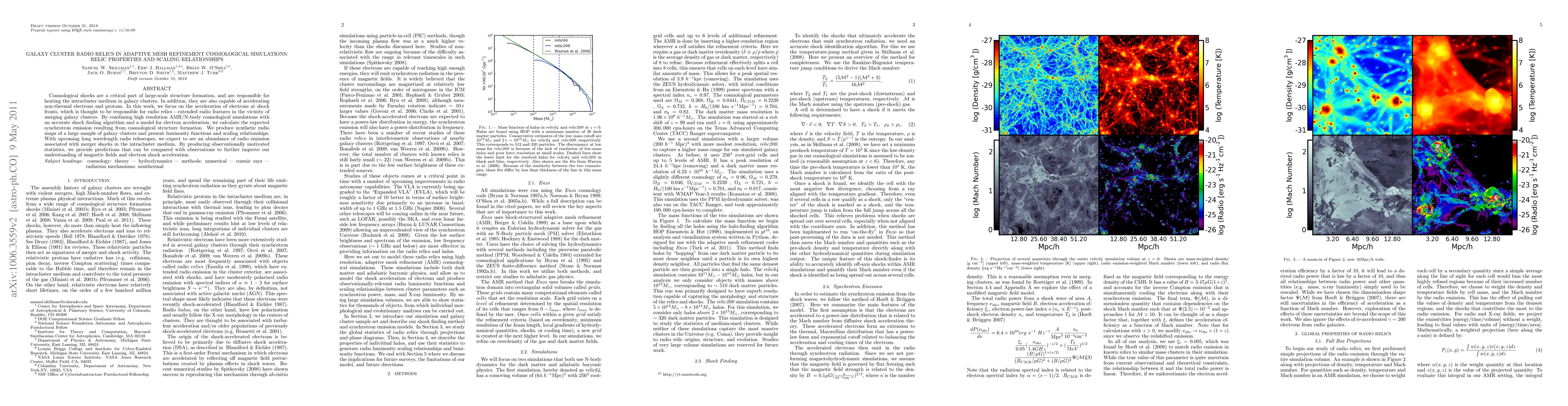 This paper investigates the properties of galaxy cluster radio relics using high-resolution adaptive mesh refinement simulations, focusing on the electron acceleration at cosmological shock fronts. It presents luminosity functions and scaling relationships for these relics, providing predictions for future radio observations to enhance our understanding of magnetic fields and shock acceleration.