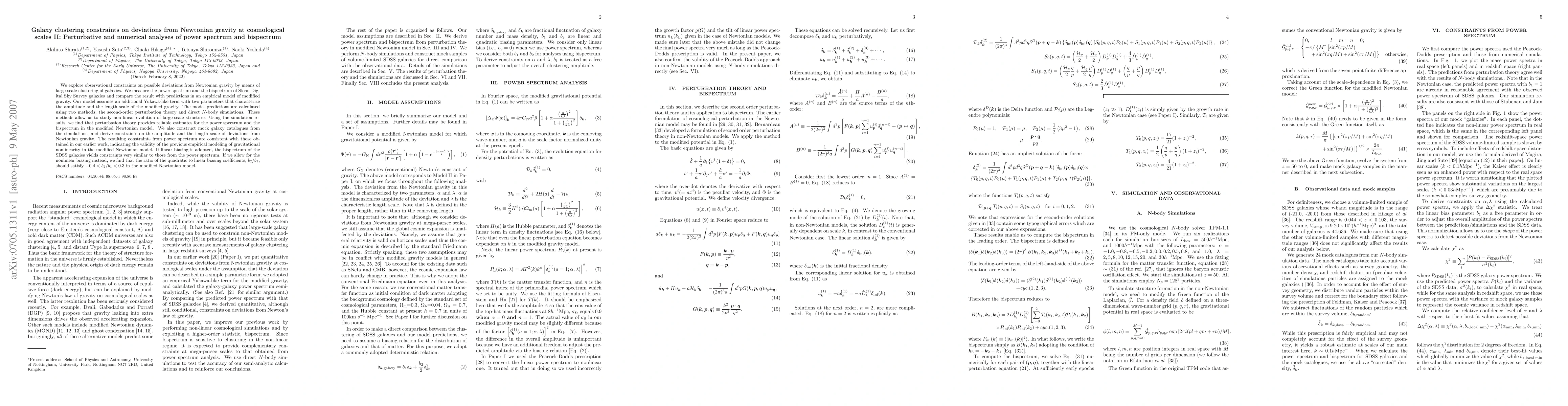 We explore observational constraints on possible deviations from Newtonian gravity by means of large-scale clustering of galaxies. We measure the power spectrum and the bispectrum of Sloan Digital Sky Survey galaxies and compare the result with predictions in an empirical model of modified gravity. Our model assumes an additional Yukawa-like term with two parameters that characterize the amplitude and the length scale of the modified gravity. The model predictions are calculated using two methods; the second-order perturbation theory and direct N-body simulations. These methods allow us to study non-linear evolution of large-scale structure. Using the simulation results, we find that perturbation theory provides reliable estimates for the power spectrum and the bispectrum in the modified Newtonian model. We also construct mock galaxy catalogues from the simulations, and derive constraints on the amplitude and the length scale of deviations from Newtonian gravity. The resulting constraints from power spectrum are consistent with those obtained in our earlier work, indicating the validity of the previous empirical modeling of gravitational nonlinearity in the modified Newtonian model. If linear biasing is adopted, the bispectrum of the SDSS galaxies yields constraints very similar to those from the power spectrum. If we allow for the nonlinear biasing instead, we find that the ratio of the quadratic to linear biasing coefficients, b_2/b_1, should satisfy -0.4 < b_2/b_1<0.3 in the modified Newtonian model.