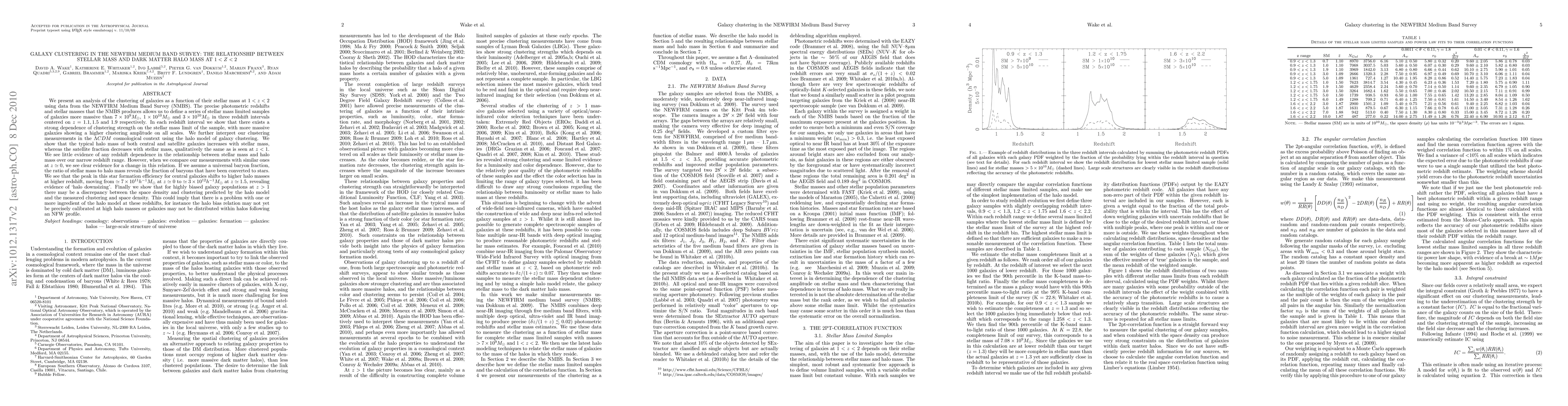 This paper analyzes galaxy clustering in the NEWFIRM Medium Band Survey, finding that more massive galaxies cluster more strongly at 1 < z < 2. It shows a strong correlation between stellar mass and dark matter halo mass, with higher stellar mass galaxies residing in more massive halos and a decreasing satellite fraction. The study reveals "halo downsizing," where peak star formation efficiency shifts to higher halo masses at higher redshifts, and notes potential discrepancies in highly biased galaxy populations at z > 1.