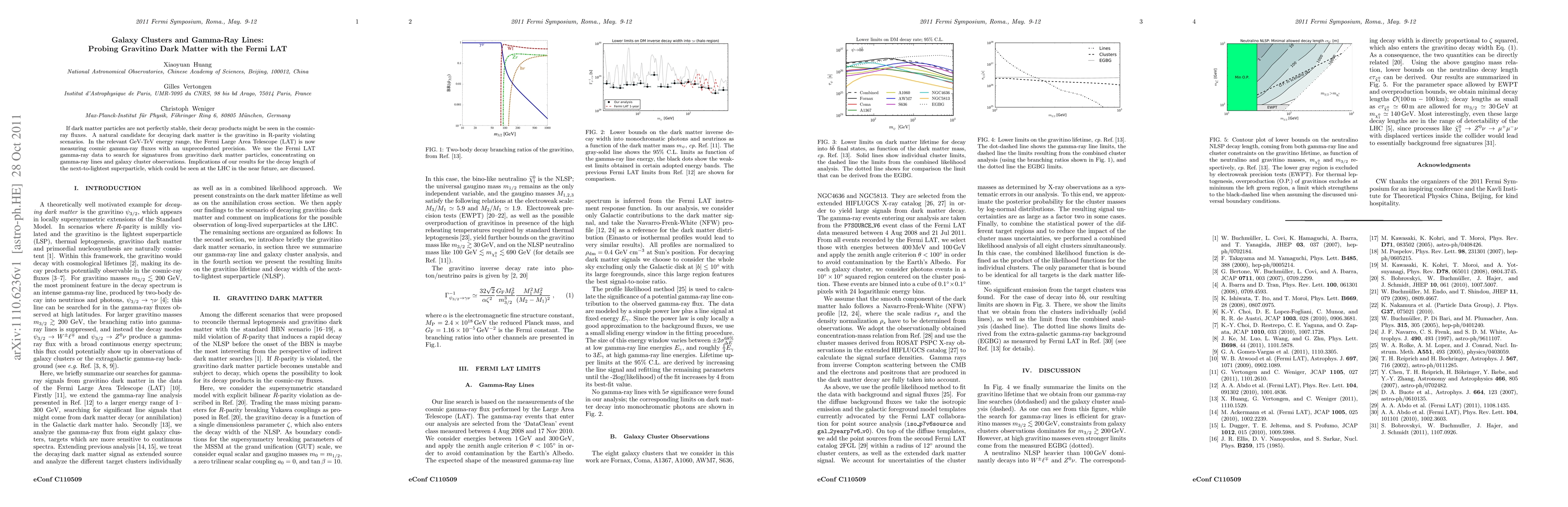 This paper investigates the potential decay of gravitino dark matter into gamma rays using Fermi LAT data, focusing on gamma-ray lines and galaxy cluster observations. The findings provide insights into the gravitino's decay length, relevant for future LHC experiments.