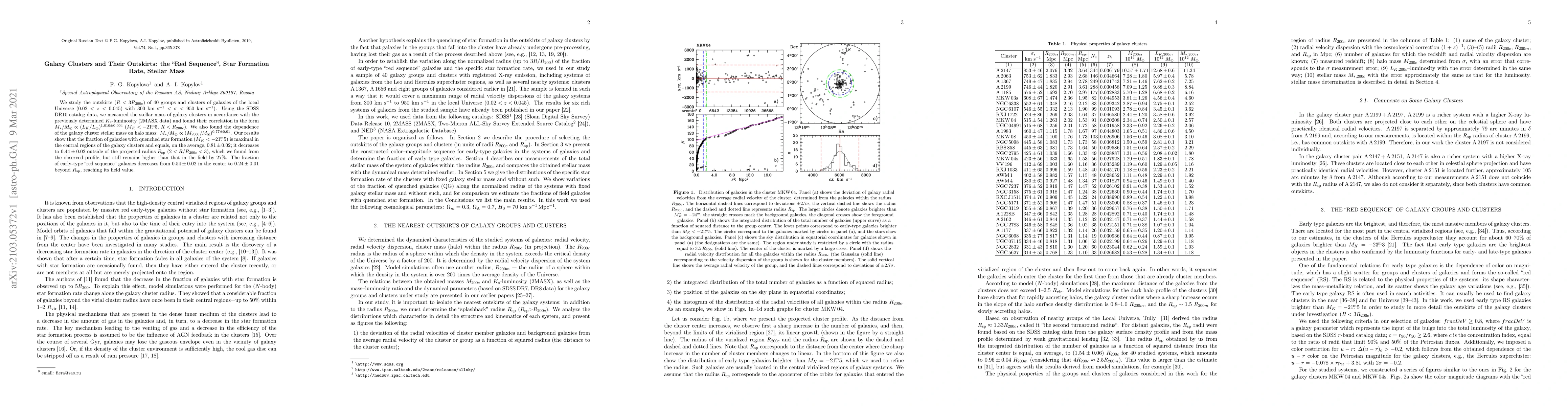 A study of 40 galaxy clusters found that star formation rates decrease with distance from cluster centers, and that stellar masses of clusters correlate with their luminosity and halo mass.