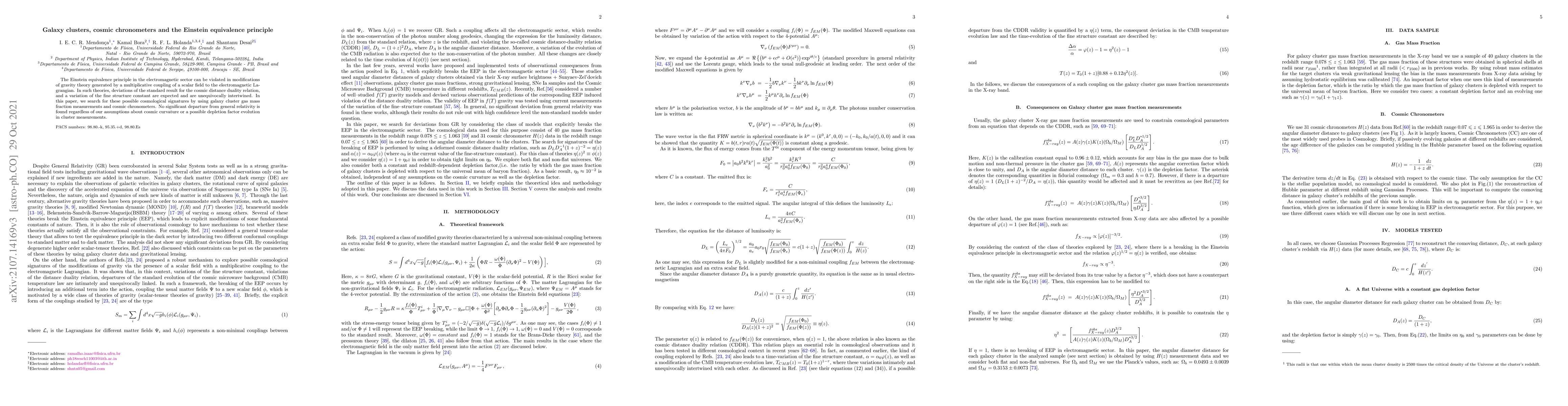 This paper investigates potential violations of the Einstein equivalence principle in modified gravity theories through galaxy cluster gas mass fraction measurements and cosmic chronometers, but finds no significant deviations from general relativity, regardless of assumptions about cosmic curvature or cluster measurement evolution.