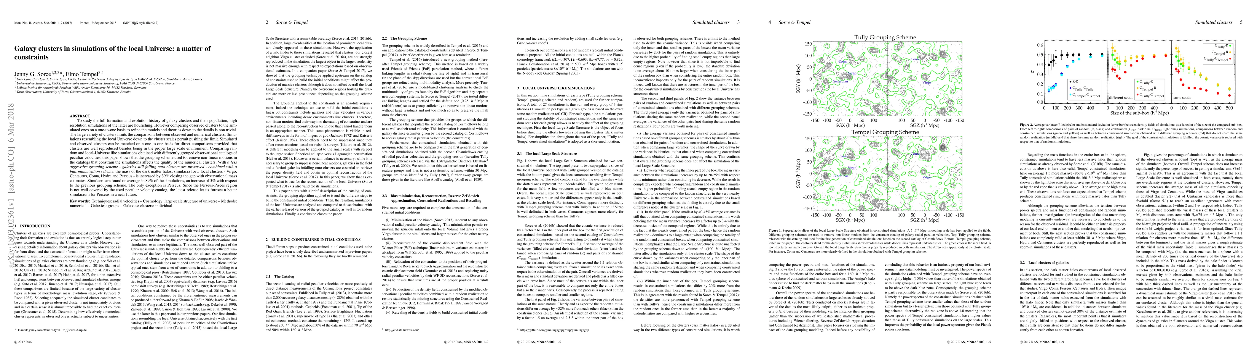 To study the full formation and evolution history of galaxy clusters and their population, high resolution simulations of the latter are flourishing. However comparing observed clusters to the simulated ones on a one-to-one basis to refine the models and theories down to the details is non trivial. The large variety of clusters limits the comparisons between observed and numerical clusters. Simulations resembling the local Universe down to the cluster scales permit pushing the limit. Simulated and observed clusters can be matched on a one-to-one basis for direct comparisons provided that clusters are well reproduced besides being in the proper large scale environment. Comparing random and local-Universe like simulations obtained with differently grouped observational catalogs of peculiar velocities, this paper shows that the grouping scheme used to remove non-linear motions in the catalogs that constrain the simulations affects the quality of the numerical clusters. With a less aggressive grouping scheme - galaxies still falling onto clusters are preserved - combined with a bias minimization scheme, the mass of the dark matter halos, simulacra for 5 local clusters - Virgo, Centaurus, Coma, Hydra and Perseus - is increased by 39% closing the gap with observational mass estimates. Simulacra are found on average in 89% of the simulations, an increase of 5% with respect to the previous grouping scheme. The only exception is Perseus. Since the Perseus-Pisces region is not well covered by the used peculiar velocity catalog, the latest release let us foresee a better simulacrum for Perseus in a near future.