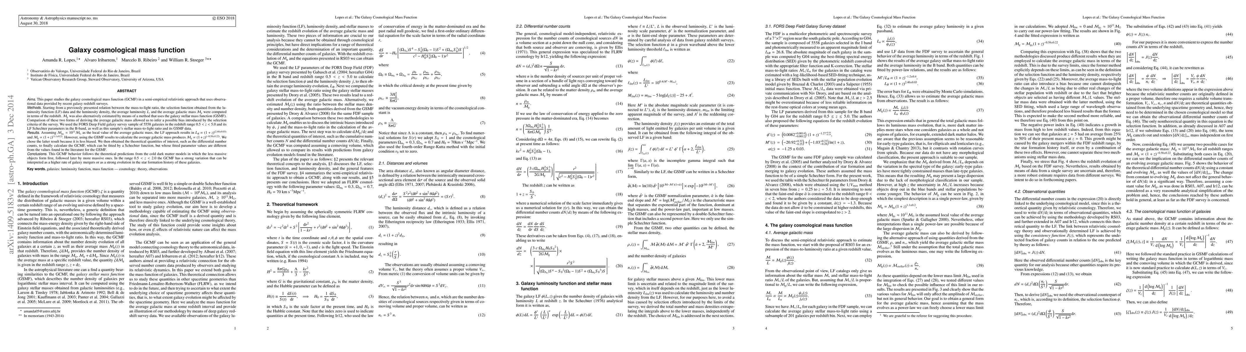 We study the galaxy cosmological mass function (GCMF) in a semi-empirical relativistic approach using observational data provided by galaxy redshift surveys. Starting from the theory of Ribeiro & Stoeger (2003, arXiv:astro-ph/0304094) between the mass-to-light ratio, the selection function obtained from the luminosity function (LF) data and the luminosity density, the average luminosity $L$ and the average galactic mass $\mathcal{M}_g$ are computed in terms of the redshift. $\mathcal{M}_g$ is also alternatively estimated by a method that uses the galaxy stellar mass function (GSMF). Comparison of these two forms of deriving the average galactic mass allows us to infer a possible bias introduced by the selection criteria of the survey. We used the FORS Deep Field galaxy survey sample of 5558 galaxies in the redshift range $0.5 < z < 5.0$ and its LF Schechter parameters in the B-band, as well as this sample's stellar mass-to-light ratio and its GSMF data. Assuming ${\mathcal{M}_{g_0}} \approx 10^{11} \mathcal{M}_\odot$ as the local value of the average galactic mass, the LF approach results in $L_{B} \propto (1+z)^{(2.40 \pm 0.03)}$ and $\mathcal{M}_g \propto (1+z)^{(1.1\pm0.2)}$. However, using the GSMF results produces $\mathcal{M}_g \propto (1+z)^{(-0.58 \pm 0.22)}$. We chose the latter result as it is less biased. We then obtained the theoretical quantities of interest, such as the differential number counts, to calculate the GCMF, which can be fitted by a Schechter function. The derived GCMF follows theoretical predictions in which the less massive objects form first, being followed later by more massive ones. In the range $0.5 < z < 2.0$ the GCMF has a strong variation that can be interpreted as a higher rate of galaxy mergers or as a strong evolution in the star formation history of these galaxies.