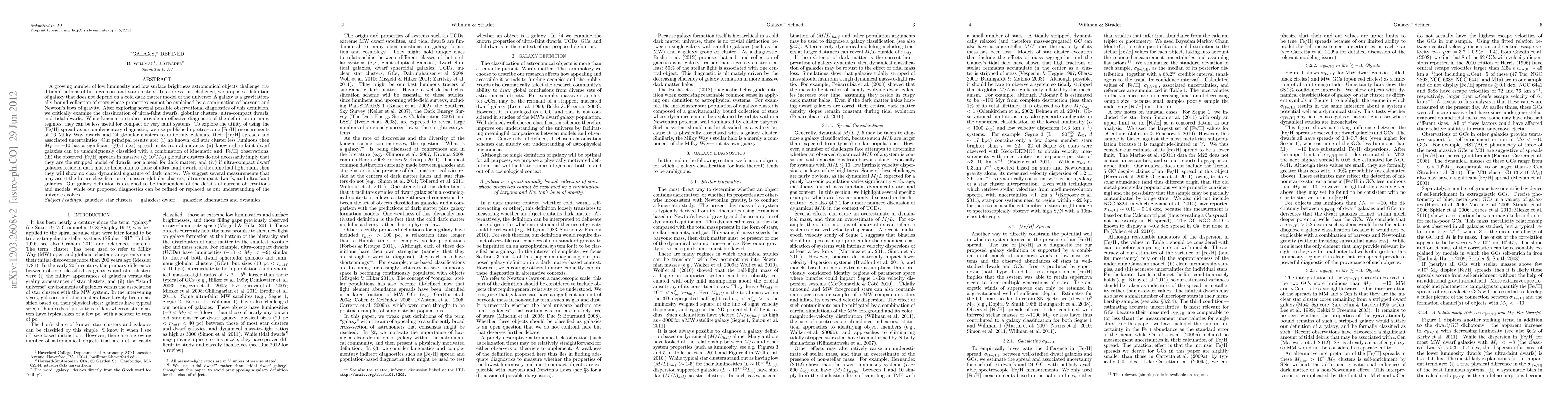 A growing number of low luminosity and low surface brightness astronomical objects challenge traditional notions of both galaxies and star clusters. To address this, we propose a definition of galaxy independent of the cold dark matter model of the universe: A galaxy is a gravitationally bound set of stars whose properties cannot be explained by a combination of baryons and Newton's laws of gravity. After exploring observational diagnostics of this definition, we examine the classification of ultra-faint dwarfs, globular clusters, ultra-compact dwarfs, and tidal dwarfs. While kinematic studies provide an effective galaxy diagnostic in many regimes, they can be less useful for compact or faint systems. To explore the use of [Fe/H] spread as a complementary diagnostic, we use published spectroscopic [Fe/H] measurements of 16 Milky Way dwarfs and 24 globular clusters to calculate their [Fe/H] spreads and uncertainties. Our principal results are: (i) no old star cluster less luminous then M_V = -10 has a significant (> 0.1 dex) spread in iron; (ii) known ultra-faint dwarfs can be classified with a combination of kinematics and [Fe/H]; (iii) the observed [Fe/H] spreads in massive (> 10^6 M_Sun) globular clusters do not necessarily imply they are the stripped nuclei of dwarfs, nor a need for dark matter; and (iv) if ultra-compact dwarfs reside in dark matter halos akin to those of ultra-faint dwarfs of the same half-light radii, then they will show no clear dynamical signature of dark matter. We suggest measurements that may assist future classification of massive globular clusters, ultra-compact dwarfs, and ultra-faint galaxies. Our galaxy definition is designed to be independent of the details of current observations and models, while our proposed diagnostics can be refined or replaced as our understanding of the universe evolves.