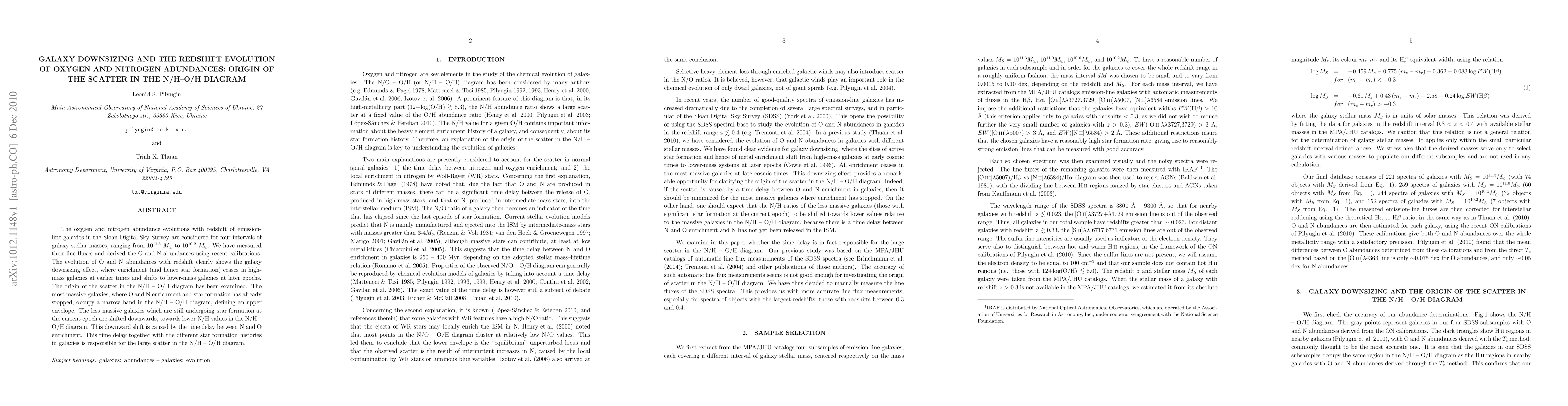 The oxygen and nitrogen abundance evolutions with redshift of emission-line galaxies in the Sloan Digital Sky Survey are considered for four intervals of galaxy stellar masses, ranging from 10^11.3 M_sun to 10^10.2 M_sun. We have measured their line fluxes and derived the O and N abundances using recent calibrations. The evolution of O and N abundances with redshift clearly shows the galaxy downsizing effect, where enrichment (and hence star formation) ceases in high-mass galaxies at earlier times and shifts to lower-mass galaxies at later epochs. The origin of the scatter in the N/H - O/H diagram has been examined. The most massive galaxies, where O and N enrichment and star formation has already stopped, occupy a narrow band in the N/H -- O/H diagram, defining an upper envelope. The less massive galaxies which are still undergoing star formation at the current epoch are shifted downwards, towards lower N/H values in the N/H - O/H diagram. This downward shift is caused by the time delay between N and O enrichment. This time delay together with the different star formation histories in galaxies is responsible for the large scatter in the N/H -- O/H diagram.