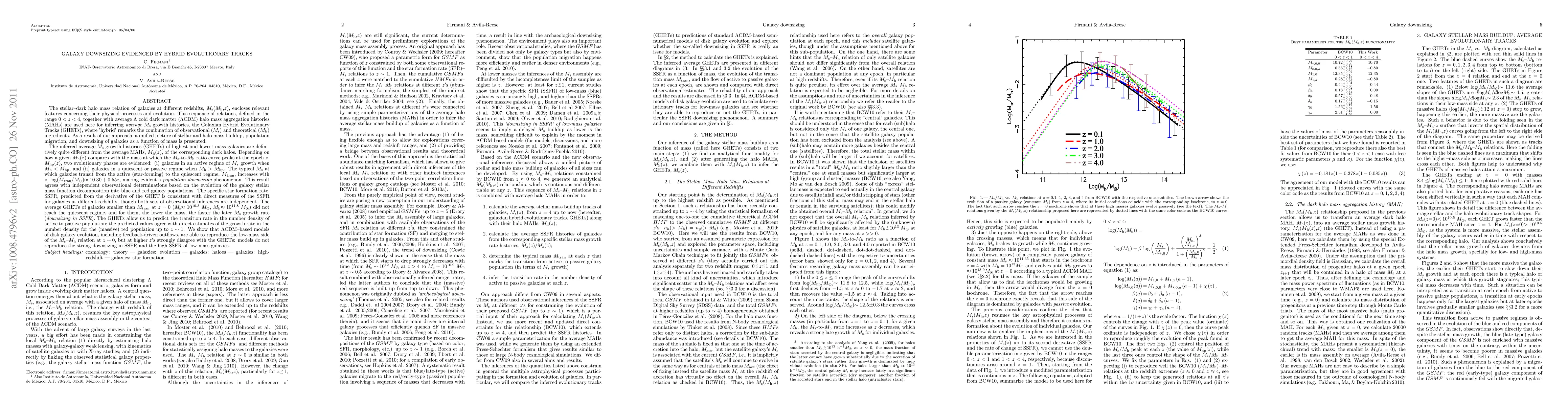An unified picture of stellar and halo mass build-up as a function of mass is presented. Inferred stellar-dark halo mass relations of galaxies, Ms-Mh, out to z=4 together with average LCDM halo mass aggregation histories (MAHs) are used for inferring average Ms growth histories, the Galaxian Hybrid Evolutionary Tracks (GHETs). The more massive the galaxy, the earlier transited in average from an active regime of Ms growth to a passive one: log(Mtran/Msun)=10.30+0.55z ("population downsizing"), where Mtran is the typical transition stellar mass. This result agrees with independent observational determinations based on the evolution of the galaxy stellar mass function decomposition into blue and red galaxies. The specific star formation rate, SSFR, predicted from the derivative of the GHET is consistent with direct measures of the SSFR for galaxies at different z's. The average GHETs of galaxies smaller than Mtran at z=0 (Ms~10^10.3 Msun) did not reach the quiescent regime, and for them, the lower the mass, the faster the later Ms growth rate ("downsizing in SSFR"). The GHETs allow to predict the transition rate in number density of active to passive population; the predicted values agree with direct estimates of growth rate in number density for the (massive) red population up to z~1. We show that LCDM-based models of disk galaxy evolution are able to reproduce the low-mass side of the Ms-Mh relation at z~0, but at higher z's disagree strongly with the GHETs: models do not reproduce the downsizing in SSFR and the high SSFR of low mass galaxies. (Abridged)
