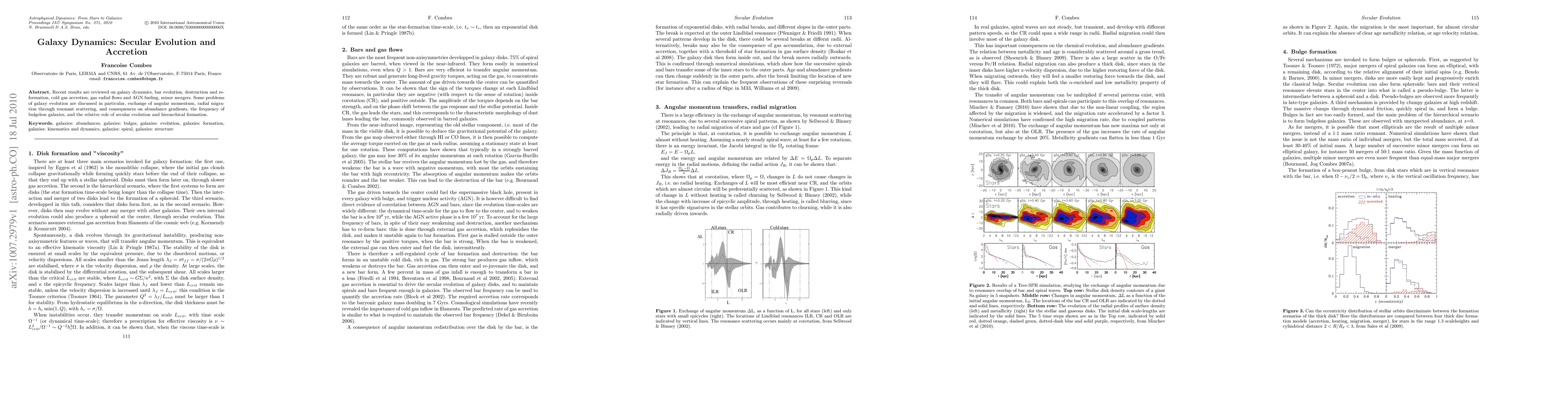 This paper reviews recent findings on galaxy dynamics, focusing on bar evolution, cold gas accretion, and AGN fueling. It discusses the exchange of angular momentum, radial migration, and their implications for abundance gradients and the frequency of bulgeless galaxies, contrasting secular evolution with hierarchical formation.