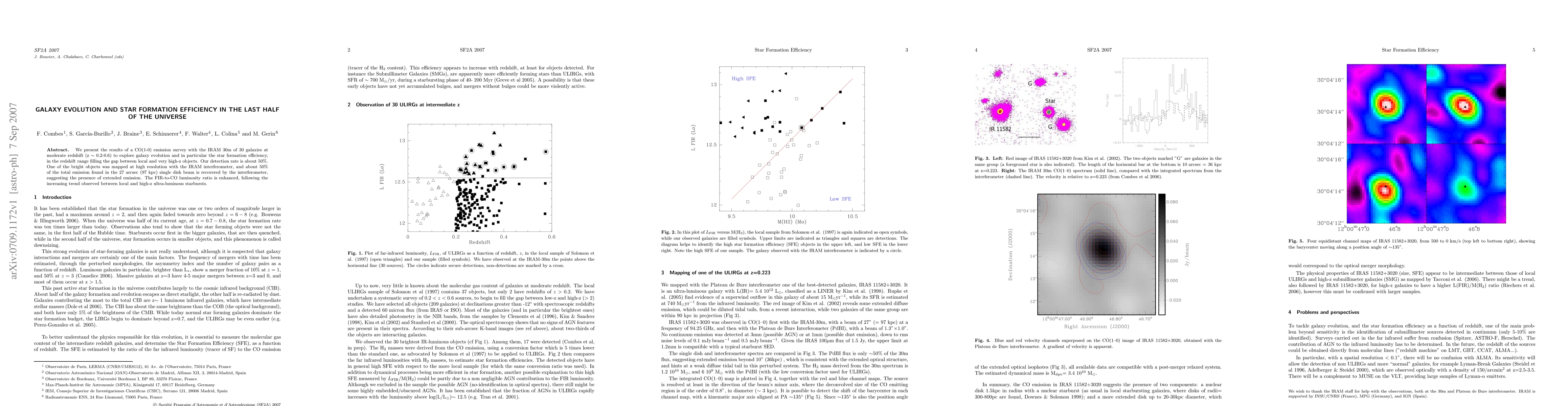 We present the results of a CO(1-0) emission survey with the IRAM 30m of 30 galaxies at moderate redshift (z ~ 0.2-0.6) to explore galaxy evolution and in particular the star formation efficiency, in the redshift range filling the gap between local and very high-z objects. Our detection rate is about 50%. One of the bright objects was mapped at high resolution with the IRAM interferometer, and about 50% of the total emission found in the 27 arcsec (97 kpc) single dish beam is recovered by the interferometer, suggesting the presence of extended emission. The FIR-to-CO luminosity ratio is enhanced, following the increasing trend observed between local and high-z ultra-luminous starbursts.