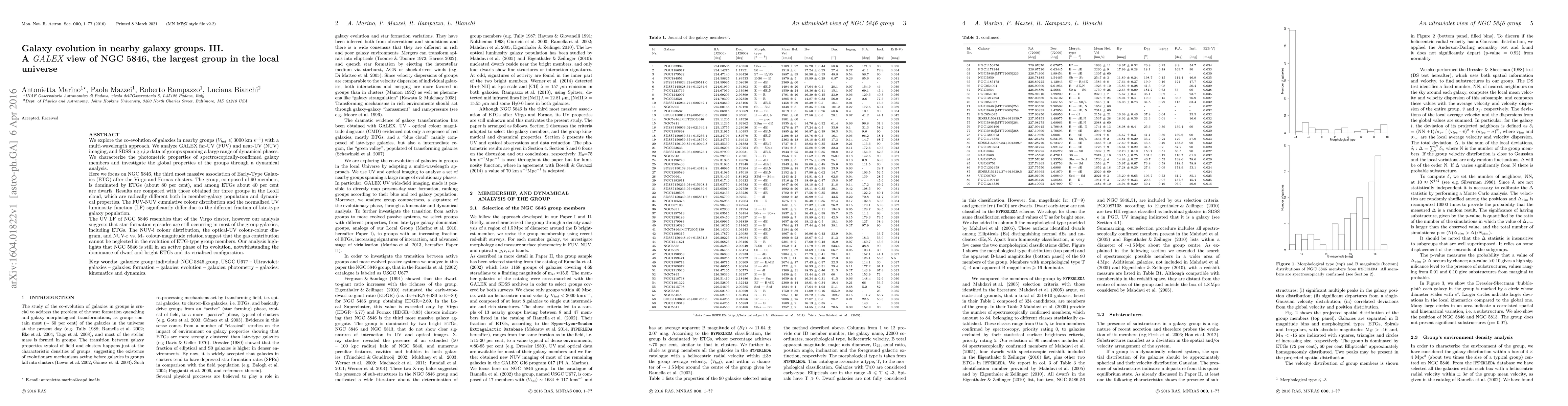 We explore the co-evolution of galaxies in nearby groups (V < 3000 km/s) with a multi-wavelength approach. We analyze GALEX far-UV (FUV) and near-UV (NUV) imaging and SDSS u,g,r,i,z data of groups spanning a large range of dynamical phases. We characterize the photometric properties of spectroscopically-confirmed galaxy members and investigate the global properties of the groups through a dynamical analysis. Here we focus on NGC 5846, the third most massive association of Early-Type Galaxies (ETG) after the Virgo and Fornax clusters. The group, composed of 90 members, is dominated by ETGs (about 80 per cent), and among ETGs about 40\% are dwarfs. Results are compared with those obtained for three groups in the LeoII cloud, which are radically different both in member-galaxy population and dynamical properties. The FUV-NUV cumulative colour distribution and the normalized UV luminosity function (LF) significantly differ due to the different fraction of late-type galaxy population. The UV LF of NGC 5846 resembles that of the Virgo cluster, however our analysis suggests that star-formation episodes are still occurring in most of the group galaxies, including ETGs. The NUV-i colour distribution, the optical-UV colour-colour diagram, and NUV-r vs. Mr colour-magnitude relation suggest that the gas contribution cannot be neglected in the evolution of ETG-type group members. Our analysis highlights that NGC~5846 is still in an active phase of its evolution, notwithstanding the dominance of dwarf and bright ETGs and its virialized configuration.