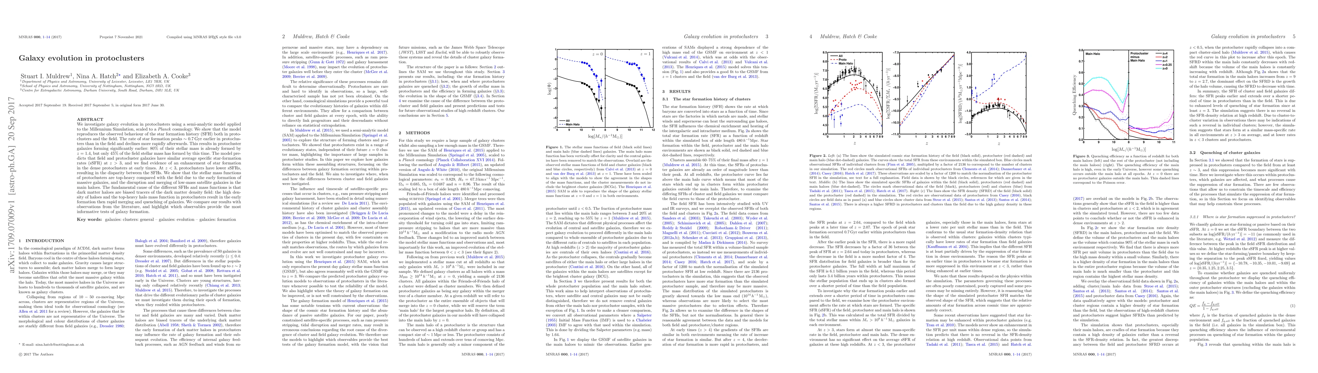We investigate galaxy evolution in protoclusters using a semi-analytic model applied to the Millennium Simulation, scaled to a Planck cosmology. We show that the model reproduces the observed behaviour of the star formation history (SFH) both in protoclusters and the field. The rate of star formation peaks $\sim0.7\,{\rm Gyr}$ earlier in protoclusters than in the field and declines more rapidly afterwards. This results in protocluster galaxies forming significantly earlier: 80% of their stellar mass is already formed by $z=1.4$, but only 45% of the field stellar mass has formed by this time. The model predicts that field and protocluster galaxies have similar average specific star-formation rates (sSFR) at $z>3$, and we find evidence of an enhancement of star formation in the dense protoclusters at early times. At $z<3$, protoclusters have lower sSFRs, resulting in the disparity between the SFHs. We show that the stellar mass functions of protoclusters are top-heavy compared with the field due to the early formation of massive galaxies, and the disruption and merging of low-mass satellite galaxies in the main haloes. The fundamental cause of the different SFHs and mass functions is that dark matter haloes are biased tracers of the dark matter density field: the high density of haloes and the top-heavy halo mass function in protoclusters result in the early formation then rapid merging and quenching of galaxies. We compare our results with observations from the literature, and highlight which observables provide the most informative tests of galaxy formation.