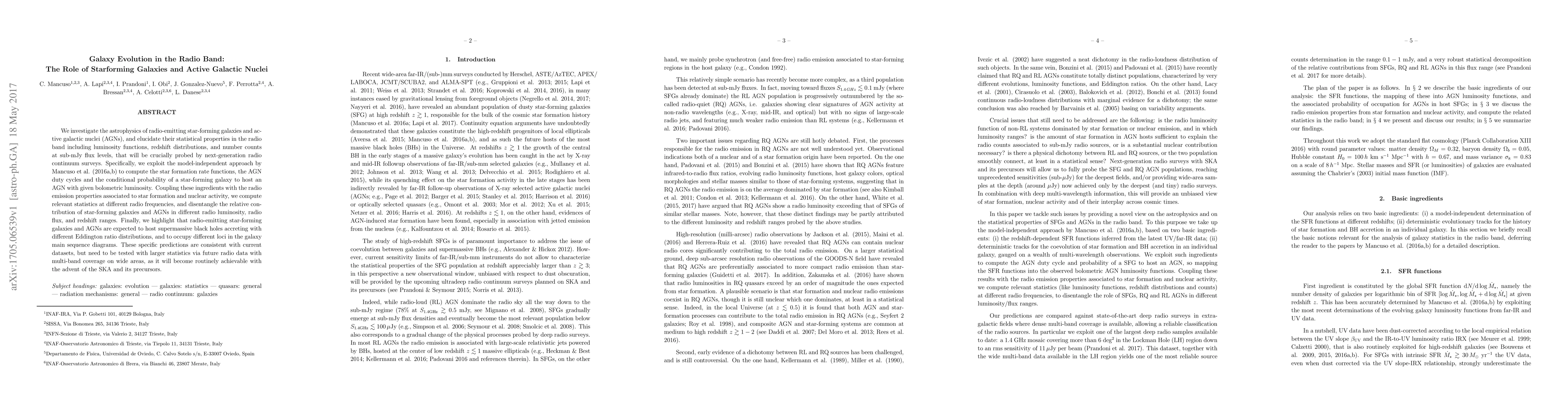 We investigate the astrophysics of radio-emitting star-forming galaxies and ac- tive galactic nuclei (AGNs), and elucidate their statistical properties in the radio band including luminosity functions, redshift distributions, and number counts at sub-mJy flux levels, that will be crucially probed by next-generation radio continuum surveys. Specifically, we exploit the model-independent approach by Mancuso et al. (2016a,b) to compute the star formation rate functions, the AGN duty cycles and the conditional probability of a star-forming galaxy to host an AGN with given bolometric luminosity. Coupling these ingredients with the radio emission properties associated to star formation and nuclear activity, we compute relevant statistics at different radio frequencies, and disentangle the relative con- tribution of star-forming galaxies and AGNs in different radio luminosity, radio flux, and redshift ranges. Finally, we highlight that radio-emitting star-forming galaxies and AGNs are expected to host supermassive black holes accreting with different Eddington ratio distributions, and to occupy different loci in the galaxy main sequence diagrams. These specific predictions are consistent with current datasets, but need to be tested with larger statistics via future radio data with multi-band coverage on wide areas, as it will become routinely achievable with the advent of the SKA and its precursors.