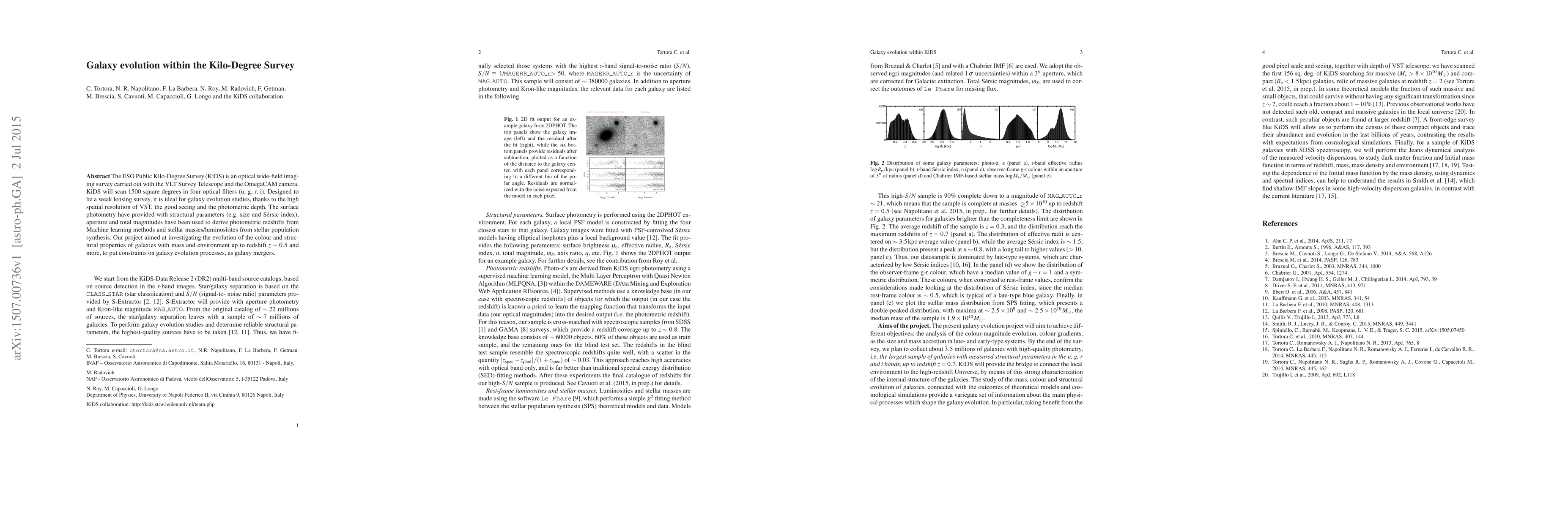 The Kilo-Degree Survey (KiDS) provides detailed galaxy structural and photometric data, enabling studies of galaxy evolution up to redshift $z \sim 0.5$. The survey's high resolution and depth allow for the investigation of galaxy colour and structural properties in relation to mass and environment, aiming to constrain galaxy evolution processes like mergers.