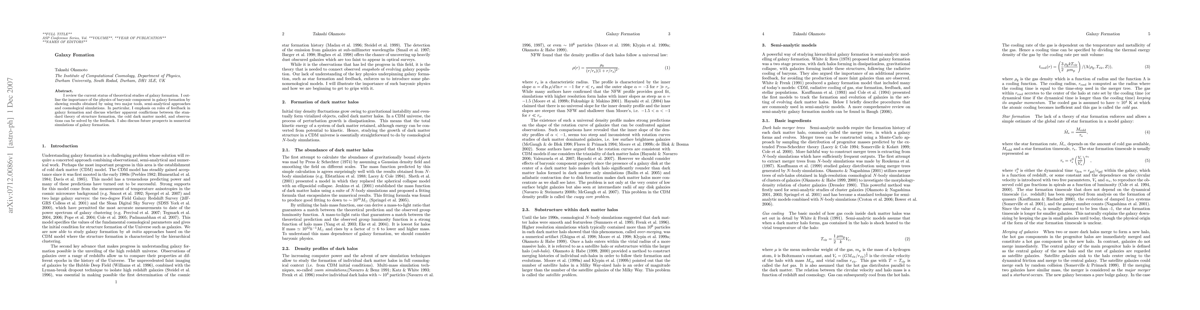 I review the current status of theoretical studies of galaxy formation. I outline the importance of the physics of baryonic component in galaxy formation by showing results obtained by using two major tools, semi-analytical approaches and cosmological simulations. In particular, I emphasis on roles of feedback in galaxy formation and discuss whether apparent conflictions between the standard theory of structure formation, the cold dark matter model, and observations can be solved by the feedback. I also discuss future prospects in numerical simulations of galaxy formation.
