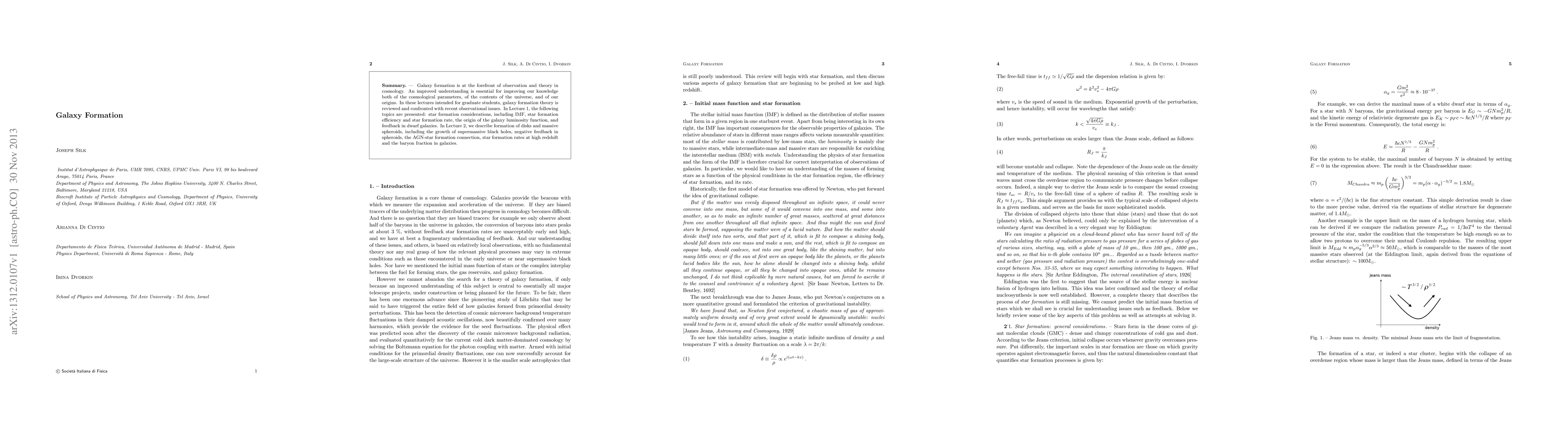 Galaxy formation is at the forefront of observation and theory in cosmology. An improved understanding is essential for improving our knowledge both of the cosmological parameters, of the contents of the universe, and of our origins. In these lectures intended for graduate students, galaxy formation theory is reviewed and confronted with recent observational issues. In Lecture 1, the following topics are presented: star formation considerations, including IMF, star formation efficiency and star formation rate, the origin of the galaxy luminosity function, and feedback in dwarf galaxies. In Lecture 2, we describe formation of disks and massive spheroids, including the growth of supermassive black holes, negative feedback in spheroids, the AGN-star formation connection, star formation rates at high redshift and the baryon fraction in galaxies.