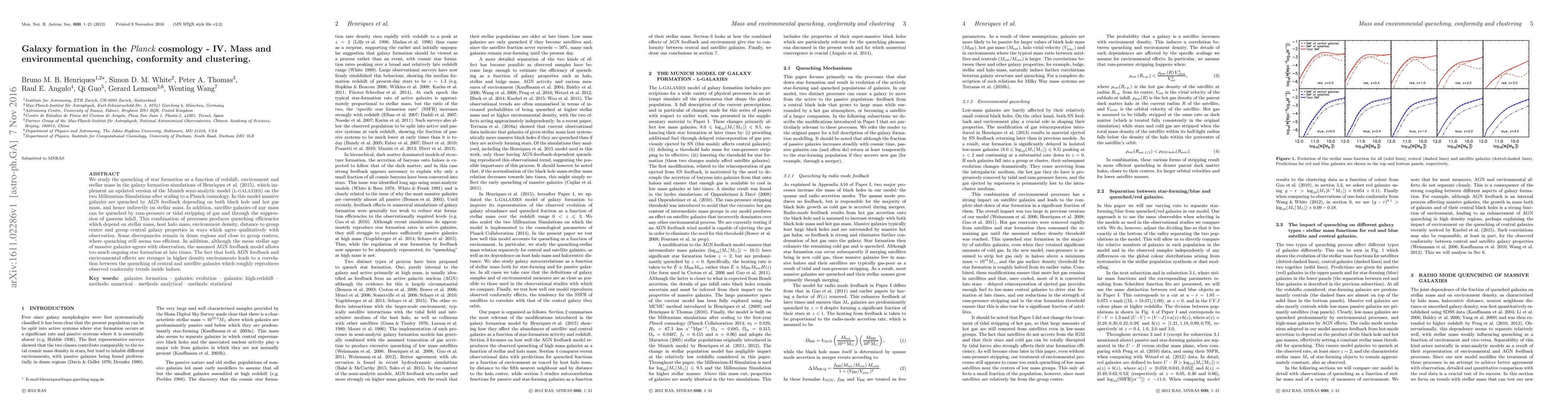 This paper investigates star formation quenching in galaxy formation simulations under the Planck cosmology, finding that massive galaxies are quenched by AGN feedback linked to black hole and hot gas mass, while satellite galaxies face quenching via gas stripping and suppression. The model's quenching efficiencies align qualitatively with observations, though discrepancies persist in dense regions and near group centers.