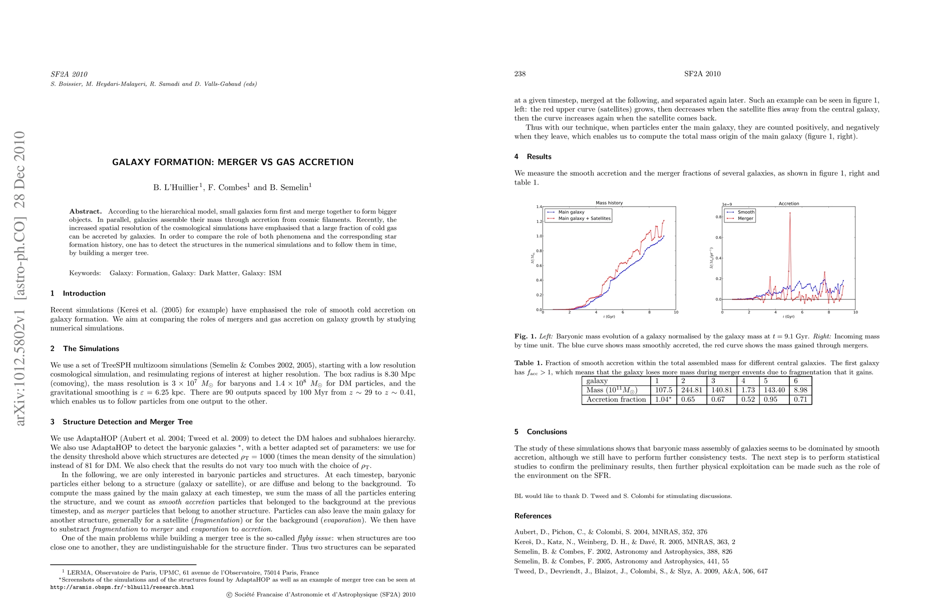 According to the hierarchical model, small galaxies form first and merge together to form bigger objects. In parallel, galaxies assemble their mass through accretion from cosmic filaments. Recently, the increased spatial resolution of the cosmological simulations have emphasised that a large fraction of cold gas can be accreted by galaxies. In order to compare the role of both phenomena and the corresponding star formation history, one has to detect the structures in the numerical simulations and to follow them in time, by building a merger tree.
