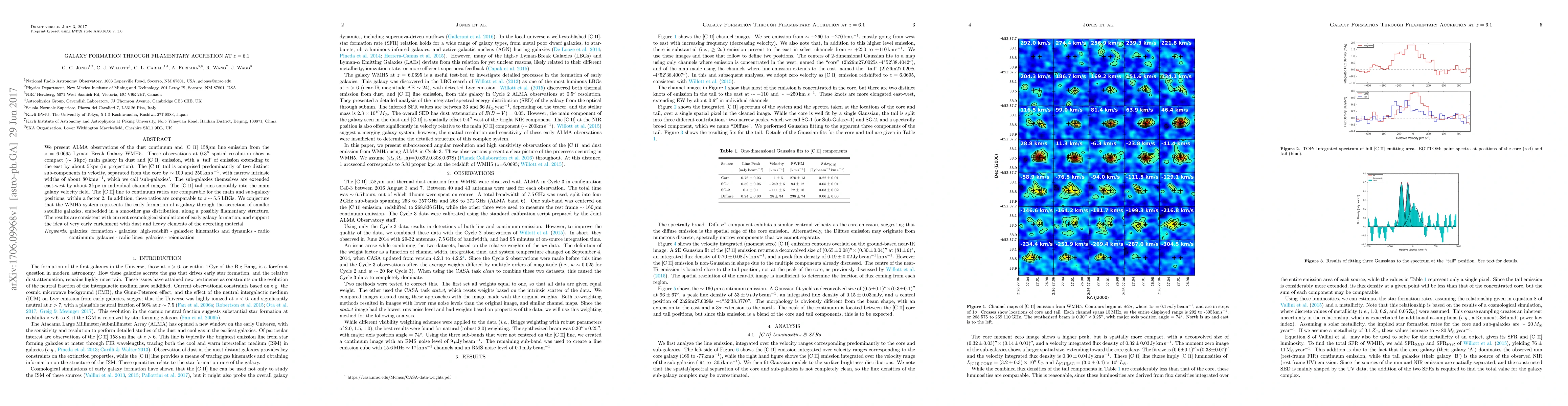 ALMA observations reveal that the z=6.0695 Lyman Break Galaxy WMH5 has a compact main galaxy with a 5kpc [C II] emission 'tail' composed of two distinct sub-components. These sub-galaxies, with comparable [C II] to continuum ratios as z~5.5 LBGs, suggest early galaxy formation via filamentary accretion of smaller satellites, supporting cosmological simulations and early enrichment of accreting material with dust and heavy elements.
