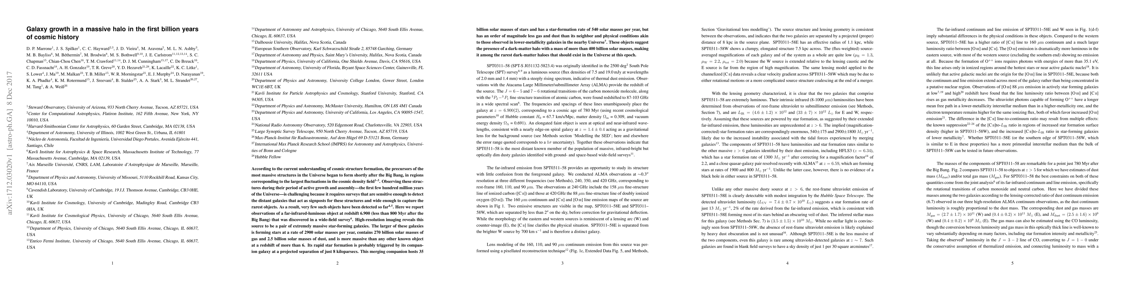 This paper reports the discovery of a pair of extremely massive star-forming galaxies at a redshift of 6.900, less than 800 million years after the Big Bang, suggesting the presence of a rare, massive dark-matter halo. The larger galaxy exhibits rapid star formation, indicating a triggering effect from its merging companion.