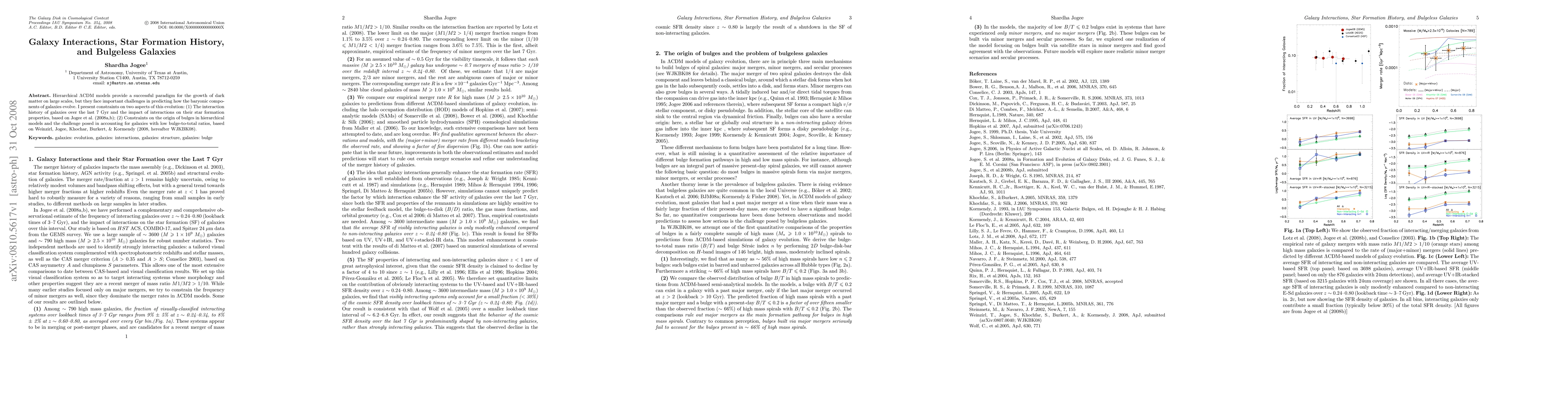Hierarchical Lambda CDM models provide a successful paradigm for the growth of dark matter on large scales, but they face important challenges in predicting how the baryonic components of galaxies evolve. I present constraints on two aspects of this evolution: (1) The interaction history of galaxies over the last 7 Gyr and the impact of interactions on their star formation properties, based on Jogee et al. (2008a,b); (2) Constraints on the origin of bulges in hierarchical models and the challenge posed in accounting for galaxies with low bulge-to-total ratios, based on Weinzirl, Jogee, Khochar, Burkert, and Kormendy (2008, hereafter WJKBK08)