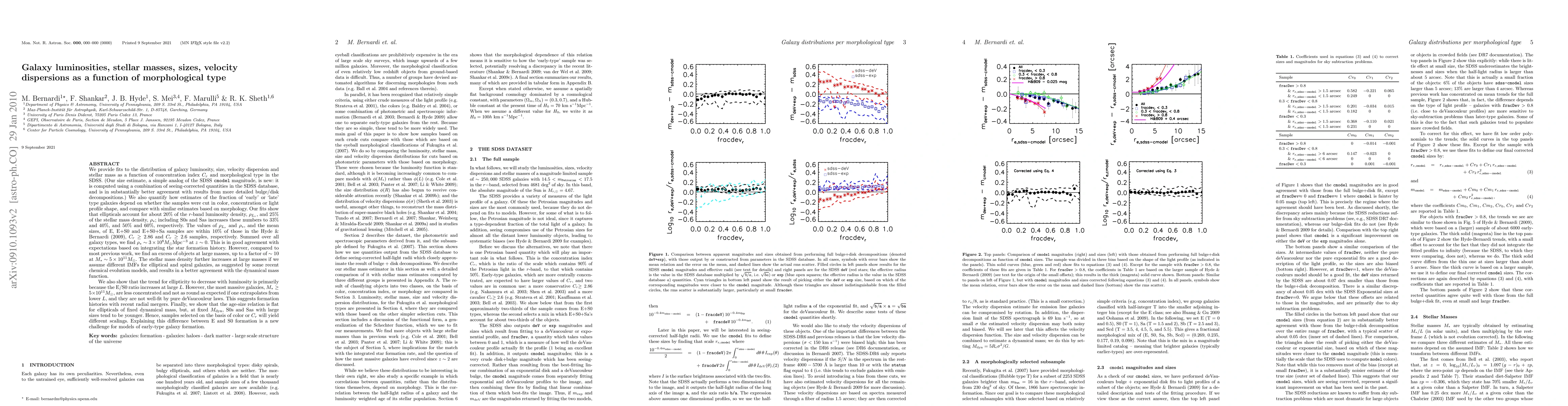 We provide fits to the distribution of galaxy luminosity, size, velocity dispersion and stellar mass as a function of concentration index C_r and morphological type in the SDSS. We also quantify how estimates of the fraction of `early' or `late' type galaxies depend on whether the samples were cut in color, concentration or light profile shape, and compare with similar estimates based on morphology. Our fits show that Es account for about 20% of the r-band luminosity density, rho_Lr, and 25% of the stellar mass density, rho_*; including S0s and Sas increases these numbers to 33% and 40%, and 50% and 60%, respectively. Summed over all galaxy types, we find rho_* ~ 3 * 10^8 M_Sun Mpc^{-3} at z ~ 0. This is in good agreement with expectations based on integrating the star formation history. However, compared to most previous work, we find an excess of objects at large masses, up to a factor of ~ 10 at M_* ~ 5*10^{11} M_Sun. The stellar mass density further increases at large masses if we assume different IMFs for Es and spiral galaxies, as suggested by some recent chemical evolution models, and results in a better agreement with the dynamical mass function. We also show that the trend for ellipticity to decrease with luminosity is primarily because the E/S0 ratio increases at large L. However, the most massive galaxies, M_* > 5 * 10^{11} M_Sun, are less concentrated and not as round as expected if one extrapolates from lower L, and they are not well-fit by pure deVaucouleur laws. This suggests formation histories with recent radial mergers. Finally, we show that the age-size relation is flat for Es of fixed dynamical mass, but, at fixed M_dyn, S0s and Sas with large sizes tend to be younger. Explaining this difference between E and S0 formation is a new challenge for models of early-type galaxy formation.