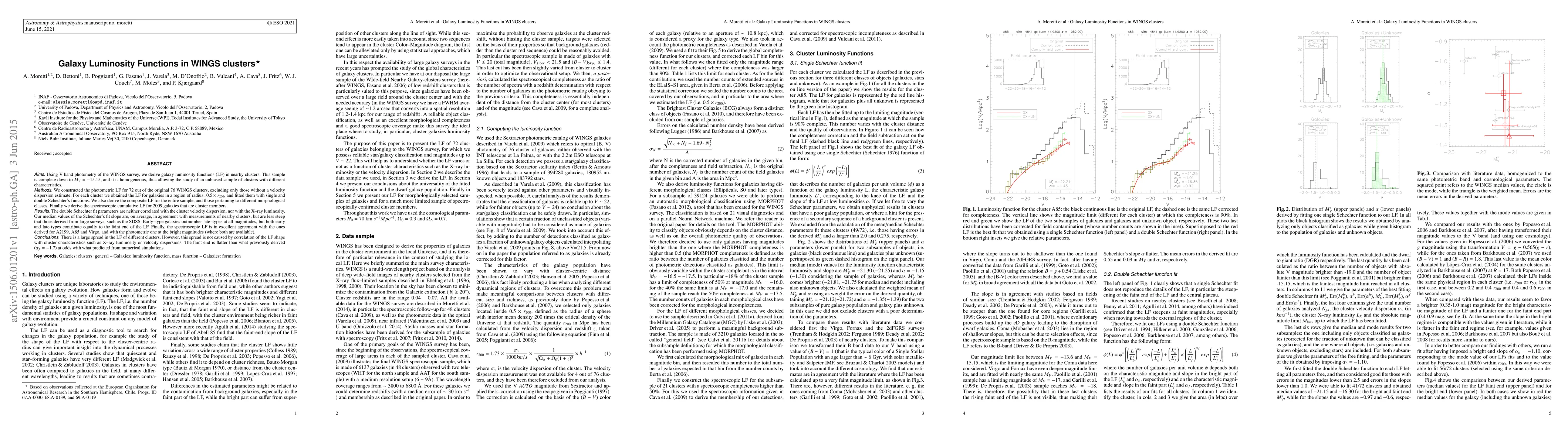 Using V band photometry of the WINGS survey, we derive galaxy luminosity functions (LF) in nearby clusters. This sample is complete down to Mv=-15.15, and it is homogeneous, thus allowing the study of an unbiased sample of clusters with different characteristics. We constructed the photometric LF for 72 out of the original 76 WINGS clusters, excluding only those without a velocity dispersion estimate. For each cluster we obtained the LF for galaxies in a region of radius=0.5 x r200, and fitted them with single and double Schechter's functions. We also derive the composite LF for the entire sample, and those pertaining to different morphological classes. Finally we derive the spectroscopic cumulative LF for 2009 galaxies that are cluster members. The double Schechter fit parameters are neither correlated with the cluster velocity dispersion, nor with the X-ray luminosity. Our median values of the Schechter's fit slope are, on average, in agreement with measurements of nearby clusters, but are less steep that those derived from large surveys, such as the SDSS. Early--type galaxies outnumber late-types at all magnitudes, but both early and late types contribute equally to the faint end of the LF. Finally, the spectroscopic LF is in excellent agreement with the ones derived for A2199, A85 and Virgo, and with the photometric one at the bright magnitudes (where both are available). There is a large spread in the LF of different clusters. However, this spread is not caused by correlation of the LF shape with cluster characteristics such as X--ray luminosity or velocity dispersions. The faint end is flatter than what previously derived (alpha_f=-1.7) at odds with what predicted from numerical simulations.