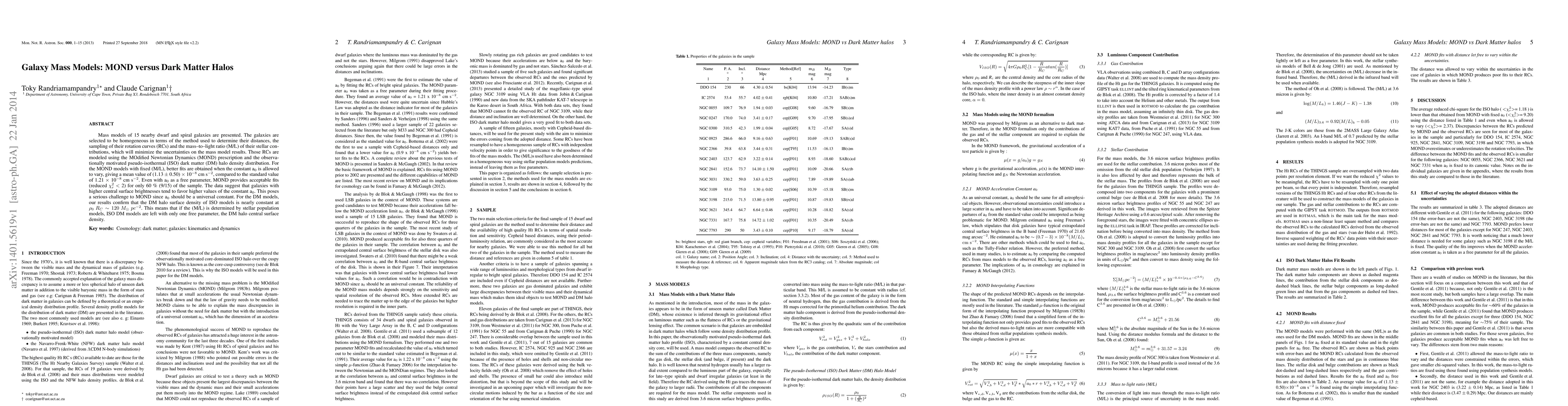Mass models of 15 nearby dwarf and spiral galaxies are presented. The galaxies are selected to be homogeneous in terms of the method used to determine their distances, the sampling of their rotation curves (RCs) and the mass-to-light ratio (M/L) of their stellar contributions, which will minimize the uncertainties on the mass model results. Those RCs are modeled using the MOdified Newtonian Dynamics (MOND) prescription and the observationally motivated pseudo-isothermal (ISO) dark matter (DM) halo density distribution. For the MOND models with fixed (M/L), better fits are obtained when the constant a$_{0}$ is allowed to vary, giving a mean value of (1.13 $\pm$ 0.50) $\times$ 10$^{-8}$ cm s$^{-2}$, compared to the standard value of 1.21 $\times$ 10$^{-8}$ cm s$^{-2}$. Even with a$_{0}$ as a free parameter, MOND provides acceptable fits (reduced $\chi^{2}_{r}$ $<$ 2) for only 60% (9/15) of the sample. The data suggest that galaxies with higher central surface brightnesses tend to favor higher values of the constant a$_{0}$. This poses a serious challenge to MOND since a$_{0}$ should be a universal constant. For the DM models, our results confirm that the DM halo surface density of ISO models is nearly constant at $ \rho_{0} \ R_{C} \sim 120\ M_{\odot} \ pc^{-2}$. This means that if the (M/L) is determined by stellar population models, ISO DM models are left with only one free parameter, the DM halo central surface density.