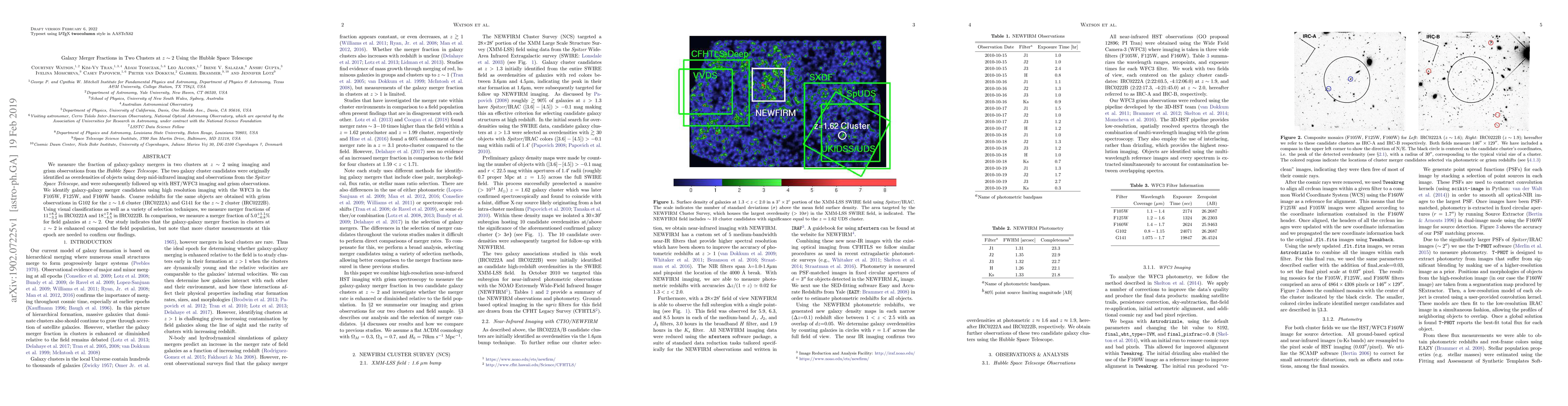 We measure the fraction of galaxy-galaxy mergers in two clusters at $z\sim2$ using imaging and grism observations from the {\it Hubble Space Telescope}. The two galaxy cluster candidates were originally identified as overdensities of objects using deep mid-infrared imaging and observations from the {\it Spitzer Space Telescope}, and were subsequently followed up with HST/WFC3 imaging and grism observations. We identify galaxy-galaxy merger candidates using high resolution imaging with the WFC3 in the F105W, F125W, and F160W bands. Coarse redshifts for the same objects are obtained with grism observations in G102 for the $z\sim1.6$ cluster (IRC0222A) and G141 for the $z\sim2$ cluster (IRC0222B). Using visual classifications as well as a variety of selection techniques, we measure merger fractions of $11_{-3.2}^{+8.2}$ in IRC0222A and $18_{-4.5}^{+7.8}$ in IRC0222B. In comparison, we measure a merger fraction of $5.0_{-0.8}^{+1.1}\%$ for field galaxies at $z\sim2$. Our study indicates that the galaxy-galaxy merger fraction in clusters at $z\sim2$ is enhanced compared the field population, but note that more cluster measurements at this epoch are needed to confirm our findings.