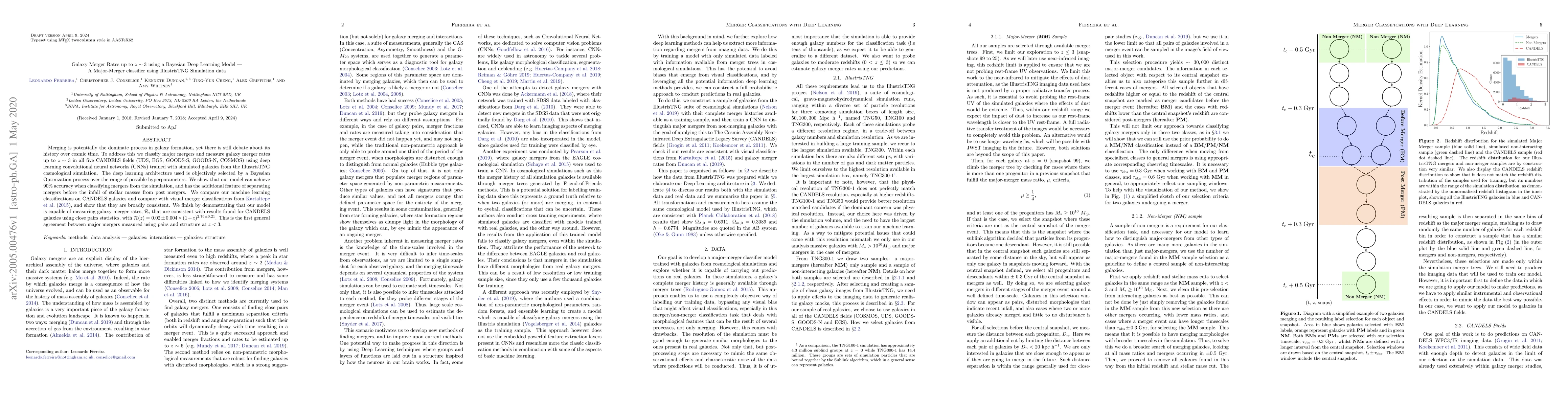 This paper uses deep learning convolutional neural networks to classify major galaxy mergers and measure merger rates up to z $\sim$ 3 using data from the CANDELS fields and the IllustrisTNG simulation. The Bayesian optimization-selected deep learning model achieves 90% accuracy in classifying mergers and is consistent with visual classifications and close pair statistics.