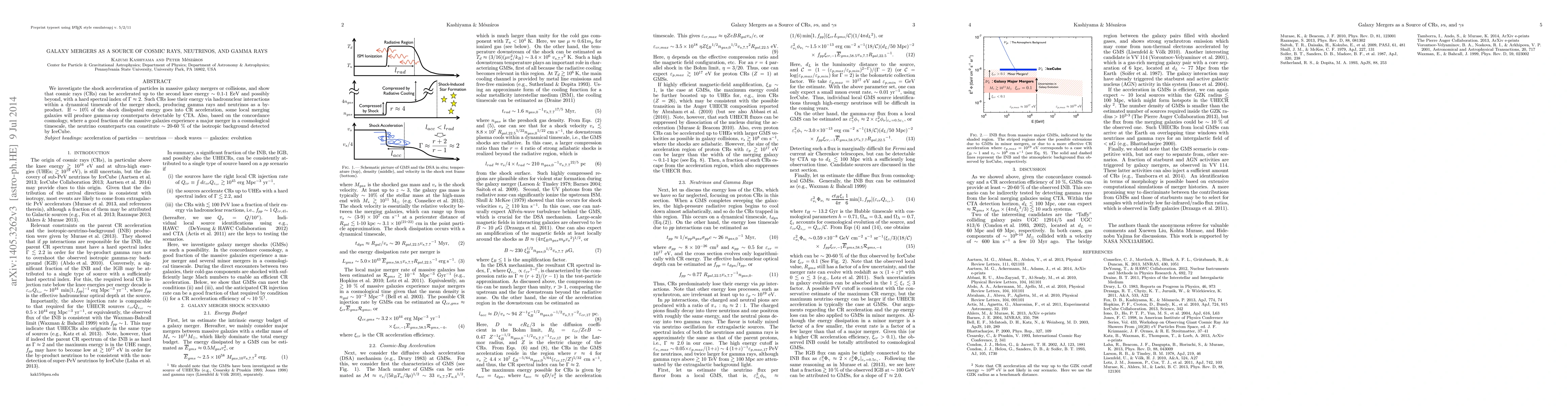 We investigate the shock acceleration of particles in massive galaxy mergers or collisions, and show that cosmic rays (CRs) can be accelerated up to the second knee energy ~0.1-1 EeV and possibly beyond, with a hard spectral index Gamma ~ 2. Such CRs lose their energy via hadronuclear interactions within a dynamical timescale of the merger shock, producing gamma rays and neutrinos as a by-product. If ~ 10 % of the shock dissipated energy goes into CR acceleration, some local merging galaxies will produce gamma-ray counterparts detectable by CTA. Also, based on the concordance cosmology, where a good fraction of the massive galaxies experience a major merger in a cosmological timescale, the neutrino counterparts can constitute ~ 20-60 % of the isotropic background detected by IceCube.