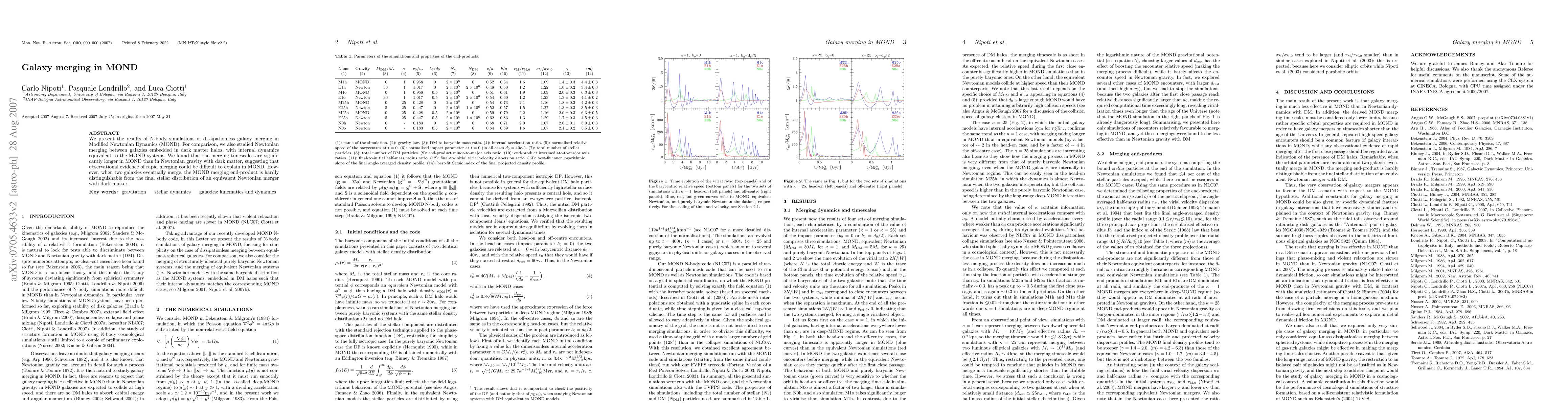 This study uses N-body simulations to compare galaxy merging in Modified Newtonian Dynamics (MOND) versus Newtonian gravity with dark matter. The results show longer merging timescales in MOND, challenging rapid merging observations, yet the final merged galaxy distributions in both scenarios are nearly identical.