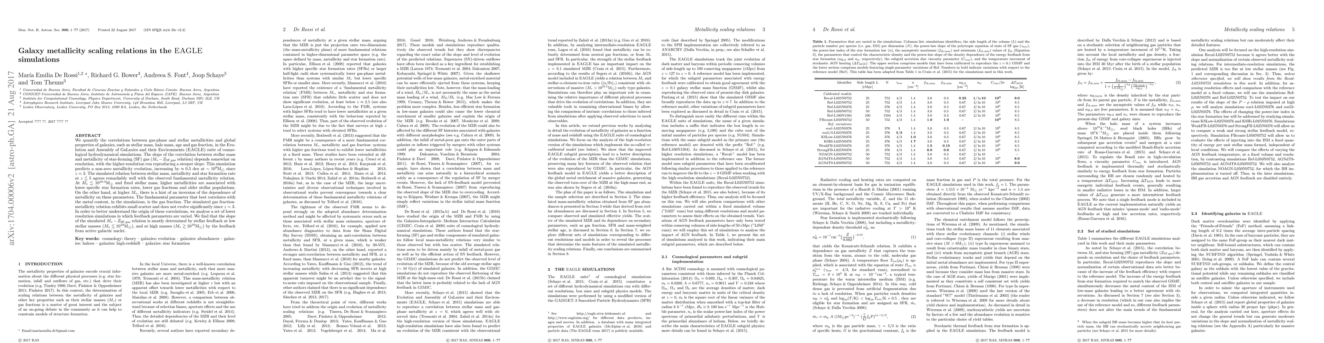 This paper investigates the metallicity scaling relations in the EAGLE simulations, finding that stellar mass correlates strongly with gas-phase metallicity, with higher resolution runs showing steeper slopes. The simulations also predict a consistent evolution with observed fundamental metallicity relations and suggest that gas fraction is the key parameter influencing metallicity.