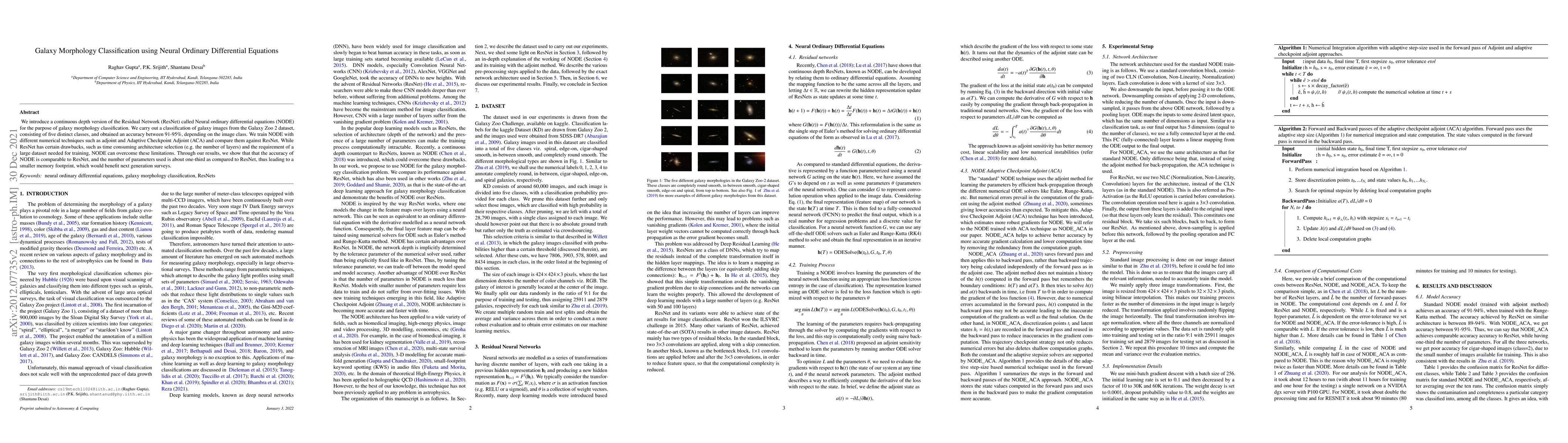 This paper proposes Neural Ordinary Differential Equations (NODE) for galaxy morphology classification, achieving 91-95% accuracy on the Galaxy Zoo 2 dataset. NODEs offer a more efficient alternative to ResNets, with fewer parameters and a smaller memory footprint.