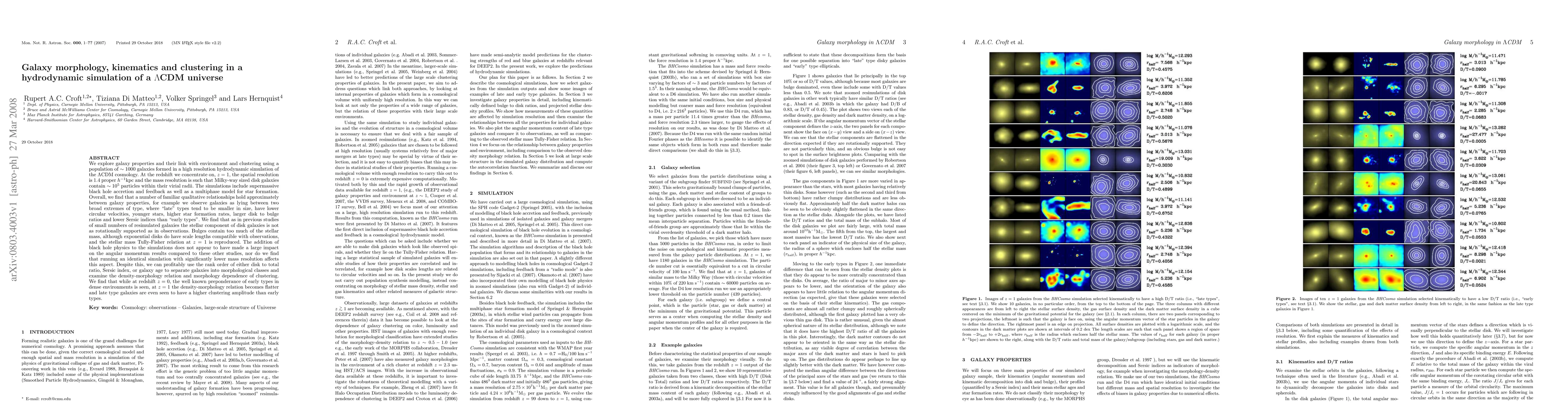We explore galaxy properties and their link with environment and clustering using a population of ~1000 galaxies formed in a high resolution hydrodynamic simulation of the Lambda CDM cosmology. At the redshift we concentrate on, z=1, the spatial resolution is 1.4 proper kpc/h and Milky-way sized disk galaxies contain ~10^5 particles within their virial radii. We include supermassive black hole accretion and feedback as well as a multiphase model for star formation. We find that a number of familiar qualitative relationships hold approximately between galaxy properties, for example, galaxies lie between two broad extremes of type, where ``late'' types tend to be smaller in size, have lower circular velocities, younger stars, higher star formation rates, larger disk to bulge ratios and lower Sersic indices than ``early types''. As in previous studies the stellar component of disk galaxies is not as rotationally supported as in observations. Bulges contain too much of the stellar mass, although disks do have scale lengths compatible with observations. The addition of black hole physics to the simulations does not appear to have an impact on the angular momentum results, nor do we find that it is affected in an identical simulation with significantly lower mass resolution. Despite this, we can profitably use the rank order of either disk to total ratio, Sersic index, or galaxy age to separate galaxies into morphological classes and examine the density-morphology relation and morphology dependence of clustering. We find that while at redshift z=0, the well known preponderance of early types in dense environments is seen, at z=1 the density-morphology relation becomes flatter and late type galaxies are even seen to have a higher clustering amplitude than early types (abridged).