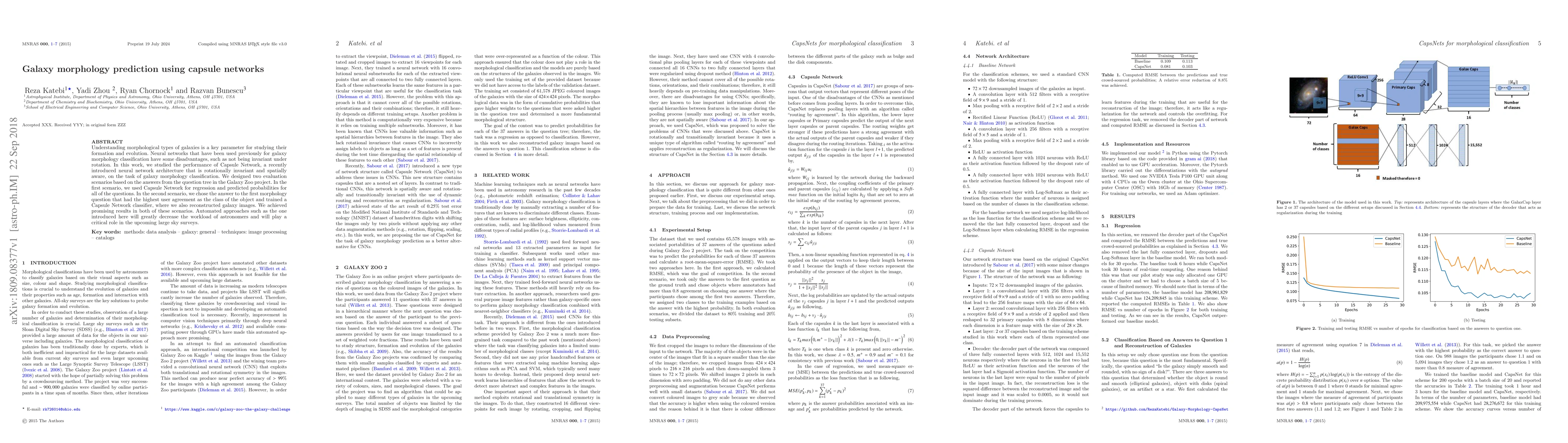 This paper explores the use of Capsule Networks for galaxy morphology classification, addressing the limitations of previous neural network methods. The study shows promising results in both regression and classification tasks, demonstrating the potential of this approach to reduce astronomers' workload and aid in large sky surveys.