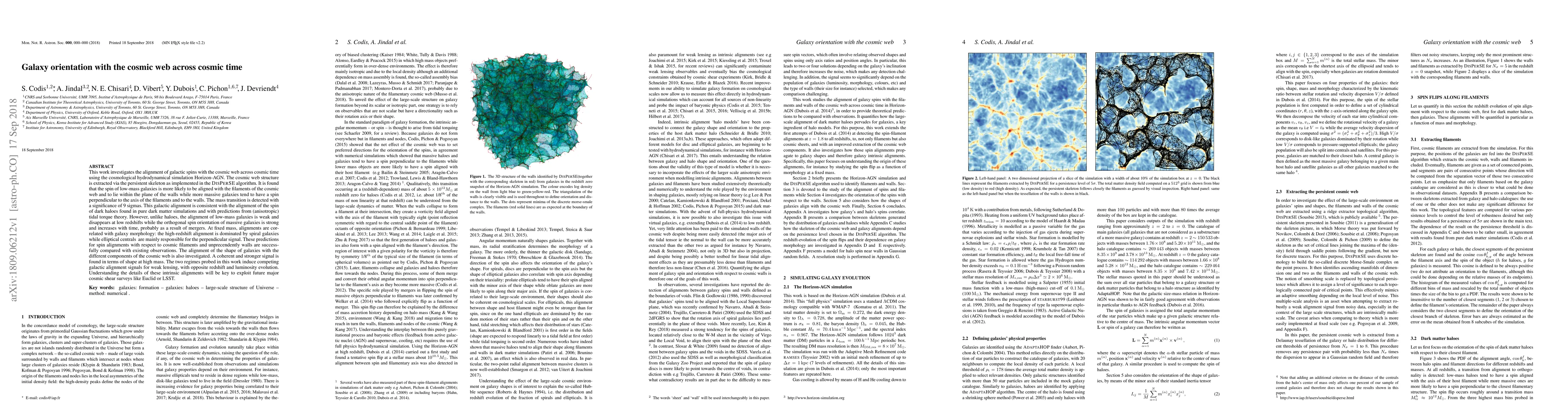 This work investigates the alignment of galactic spins with the cosmic web across cosmic time using the cosmological hydrodynamical simulation Horizon-AGN. The cosmic web structure is extracted via the persistent skeleton as implemented in the DISPERSE algorithm. It is found that the spin of low-mass galaxies is more likely to be aligned with the filaments of the cosmic web and to lie within the plane of the walls while more massive galaxies tend to have a spin perpendicular to the axis of the filaments and to the walls. The mass transition is detected with a significance of 9 sigmas. This galactic alignment is consistent with the alignment of the spin of dark haloes found in pure dark matter simulations and with predictions from (anisotropic) tidal torque theory. However, unlike haloes, the alignment of low-mass galaxies is weak and disappears at low redshifts while the orthogonal spin orientation of massive galaxies is strong and increases with time, probably as a result of mergers. At fixed mass, alignments are correlated with galaxy morphology: the high-redshift alignment is dominated by spiral galaxies while elliptical centrals are mainly responsible for the perpendicular signal. These predictions for spin alignments with respect to cosmic filaments and unprecendently walls are successfully compared with existing observations. The alignment of the shape of galaxies with the different components of the cosmic web is also investigated. A coherent and stronger signal is found in terms of shape at high mass. The two regimes probed in this work induce competing galactic alignment signals for weak lensing, with opposite redshift and luminosity evolution. Understanding the details of these intrinsic alignments will be key to exploit future major cosmic shear surveys like Euclid or LSST.