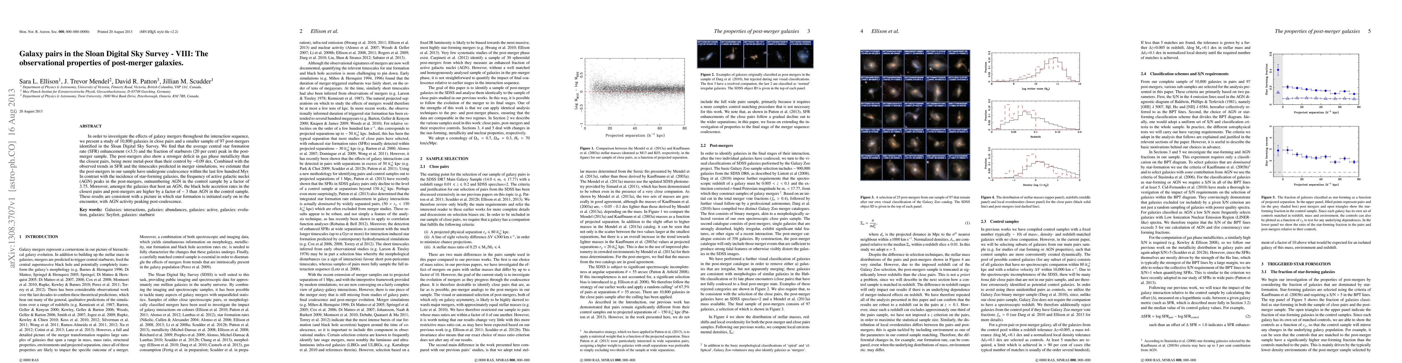 This study examines the observational properties of 97 post-merger galaxies identified in the Sloan Digital Sky Survey, finding significant enhancements in star formation rates and starburst activity compared to close pairs. The post-merger galaxies also show a notable deficit in gas phase metallicity and a higher frequency of active galactic nuclei, suggesting star formation initiates early in mergers while AGN activity peaks after coalescence.