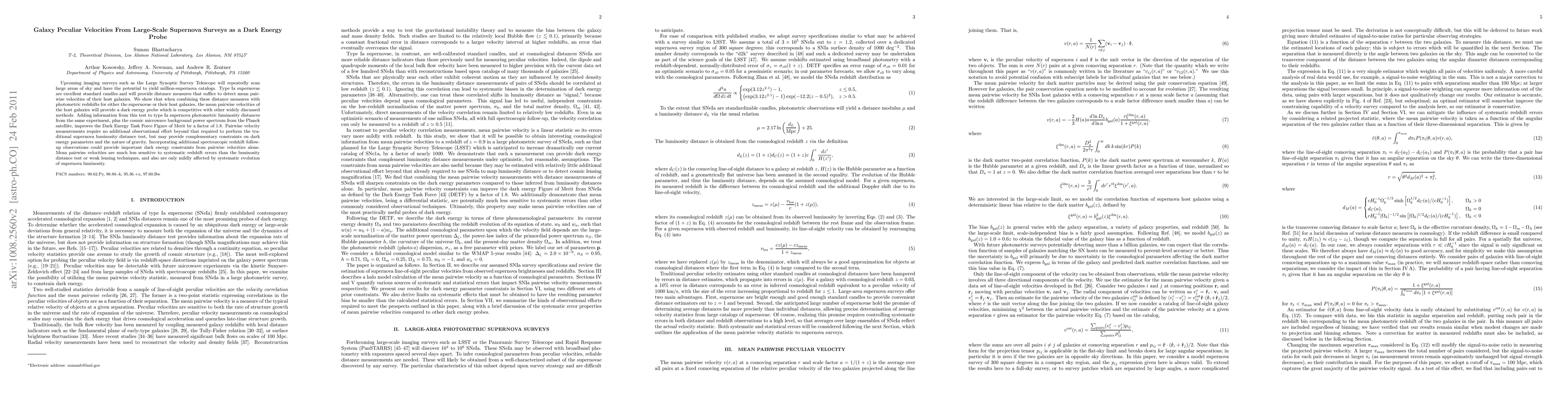 This paper proposes using galaxy peculiar velocities derived from large-scale supernova surveys to probe dark energy, demonstrating that this method is competitive with other techniques. The addition of pairwise velocity measurements to traditional supernova luminosity tests enhances the Dark Energy Task Force Figure of Merit by 1.8, offering complementary constraints on dark energy parameters.