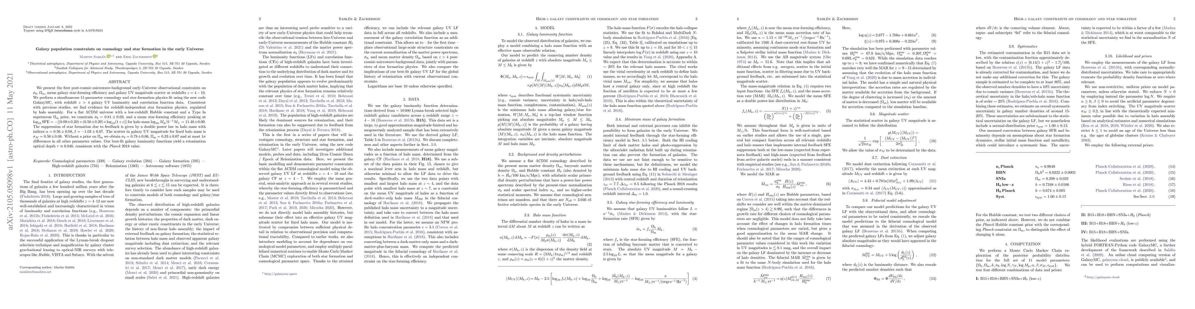 We present the first post-cosmic-microwave-background early-Universe observational constraints on $\sigma_8$, $\Omega_{\rm m}$, mean galaxy star-forming efficiency and galaxy UV magnitude scatter at redshifts $z = 4-10$. We perform a simultaneous 11-parameter cosmology and star-formation physics fit using the new code GalaxyMC, with redshift $z>4$ galaxy UV luminosity and correlation function data. Consistent with previous studies, we find evidence for redshift-independent star formation physics, regulated by halo assembly. For a flat $\Lambda$CDM universe with a low-redshift Hubble constant and a Type Ia supernovae $\Omega_{\rm m}$ prior, we constrain $\sigma_8 = 0.81 \pm 0.03$, and a mean star-forming efficiency peaking at $\log_{10} {\rm SFE} = -[(0.09 \pm 0.20) + (0.58 \pm 0.29) \times \log_{10} (1+z)]$ for halo mass $\log_{10} M_{\rm p} / h^{-1} M_{\odot} = 11.48 \pm 0.09$. The suppression of star formation due to feedback is given by a double power law in halo mass with indices $\alpha = 0.56 \pm 0.08, \beta = -1.03 \pm 0.07$. The scatter in galaxy UV magnitude for fixed halo mass is $\sigma_M = 0.56 \pm 0.08$. Without a prior on $\Omega_{\rm m}$ we obtain $\sigma_8 = 0.78 \pm 0.06$, $\Omega_{\rm m} = 0.33 \pm 0.07$ and at most $1\sigma$ differences in all other parameter values. Our best-fit galaxy luminosity functions yield a reionization optical depth $\tau \approx 0.048$, consistent with the Planck 2018 value.