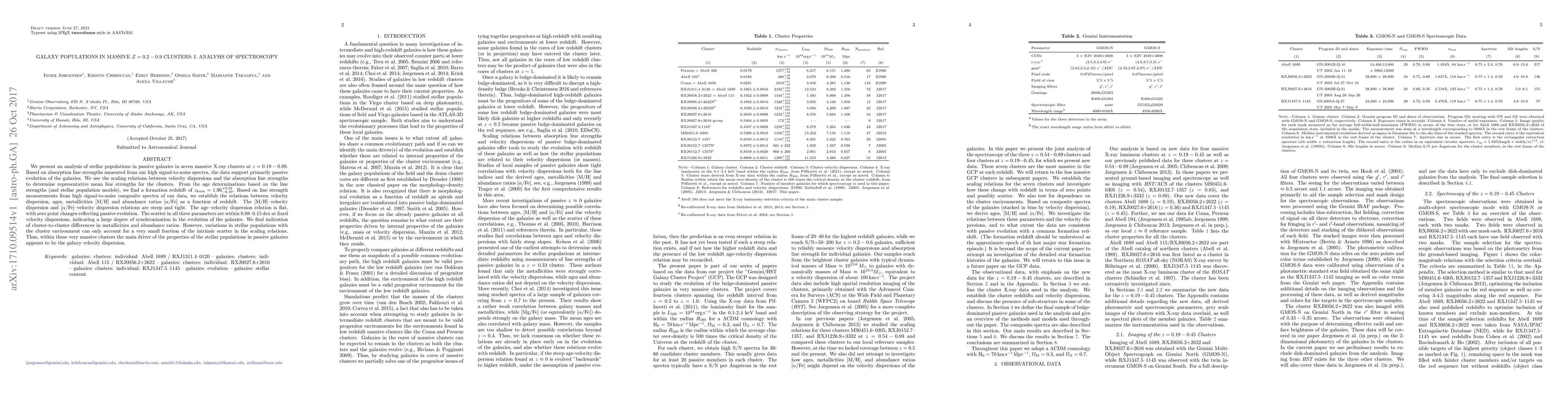 We present an analysis of stellar populations in passive galaxies in seven massive X-ray clusters at z=0.19-0.89. Based on absorption line strengths measured from our high signal-to-noise spectra, the data support primarily passive evolution of the galaxies. We use the scaling relations between velocity dispersions and the absorption line strengths to determine representative mean line strengths for the clusters. From the age determinations based on the line strengths (and stellar population models), we find a formation redshift of z_form=1.96(-0.19,+0.24). Based on line strength measurements from high signal-to-noise composite spectra of our data, we establish the relations between velocity dispersion, ages, metallicities [M/H] and abundance ratios [alpha/Fe] as a function of redshift. The [M/H]-velocity dispersion and [alpha/Fe]-velocity dispersion relations are steep and tight. The age-velocity dispersion relation is flat, with zero point changes reflecting passive evolution. The scatter in all three parameters are within 0.08-0.15 dex at fixed velocity dispersions, indicating a large degree of synchronization in the evolution of the galaxies. We find indication of cluster-to-cluster differences in metallicities and abundance ratios. However, variations in stellar populations with the cluster environment can only account for a very small fraction of the intrinsic scatter in the scaling relations. Thus, within these very massive clusters the main driver of the properties of the stellar populations in passive galaxies appears to be the galaxy velocity dispersion.