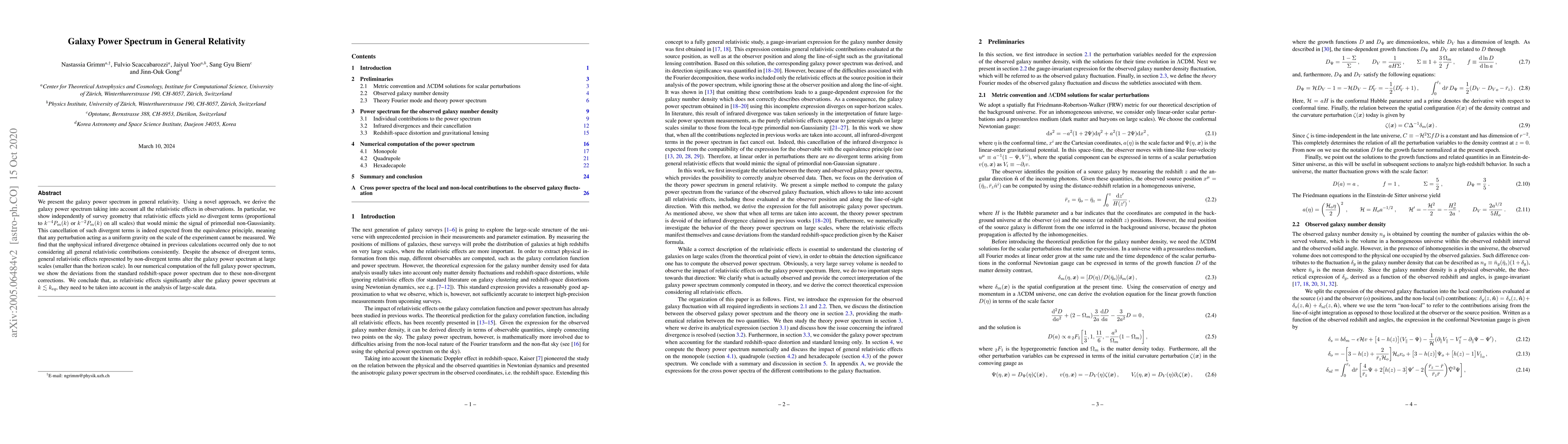 Researchers derived a galaxy power spectrum in general relativity, finding that relativistic effects alter large-scale structure without introducing divergent terms that mimic primordial non-Gaussianity. These effects must be accounted for when analyzing large-scale data to accurately understand the universe.