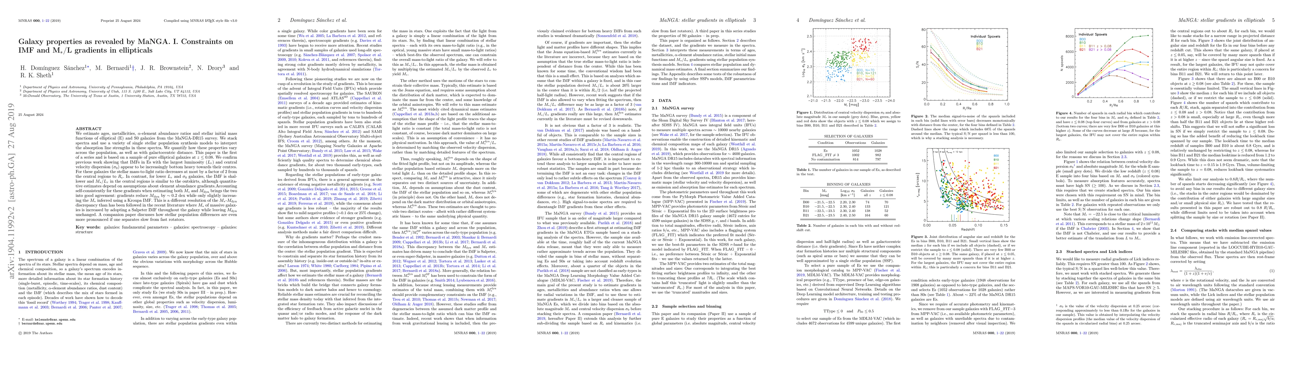 We estimate ages, metallicities, $\alpha$-element abundance ratios and stellar initial mass functions of elliptical (E) and S0 galaxies from the MaNGA-DR15 survey. We stack spectra and use a variety of single stellar population synthesis models to interpret the absorption line strengths in these spectra. We quantify how these properties vary across the population, as well as with galactocentric distance. This paper is the first of a series and is based on a sample of pure elliptical galaxies at z $\le$ 0.08. We show that the properties of the inner regions of Es with the largest luminosity (L$_r$) and central velocity dispersion ($\sigma_0$) are consistent with those associated with the commonly used Salpeter IMF, whereas a Kroupa-like IMF is a better description at $\sim$ 0.8R/Re (assuming [Ti/Fe] variations are limited). For these galaxies the stellar mass-to-light ratio decreases at most by a factor of 2 from the central regions to Re. In contrast, for lower L$_r$ and $\sigma_0$ galaxies, the IMF is shallower and M$_{*}$/L$_r$ in the central regions is similar to the outskirts. Although a factor of 2 is smaller than previous reports based on a handful of galaxies, it is still large enough to matter for dynamical mass estimates. Accounting self-consistently for these gradients when estimating both M$_{*}$ and M$_{dyn}$ brings the two into good agreement: gradients reduce M$_{dyn}$ by $\sim$ 0.2 dex while only slightly increasing the M$_{*}$ inferred using a Kroupa IMF. This is a different resolution of the M$_{*}$-M$_{dyn}$ discrepancy than has been followed in the recent literature where M$_{*}$ of massive galaxies is increased by adopting a Salpeter IMF while leaving Mdyn unchanged. A companion paper discusses how stellar population differences are even more pronounced if one separates slow from fast rotators.