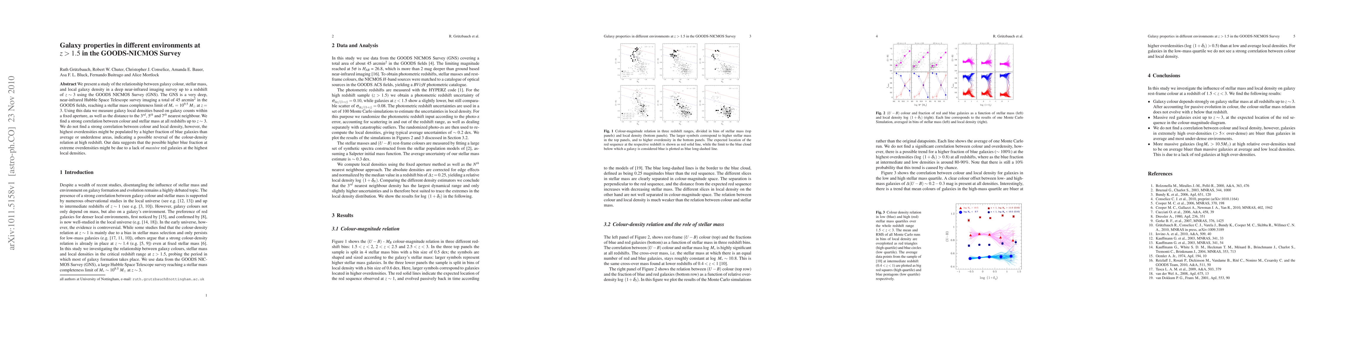 This study investigates galaxy colour, stellar mass, and local density relationships in the GOODS-NICMOS Survey up to z~3, finding a strong colour-stellar mass correlation but no strong colour-density correlation, suggesting a potential reversal of the colour-density relation at high redshift.