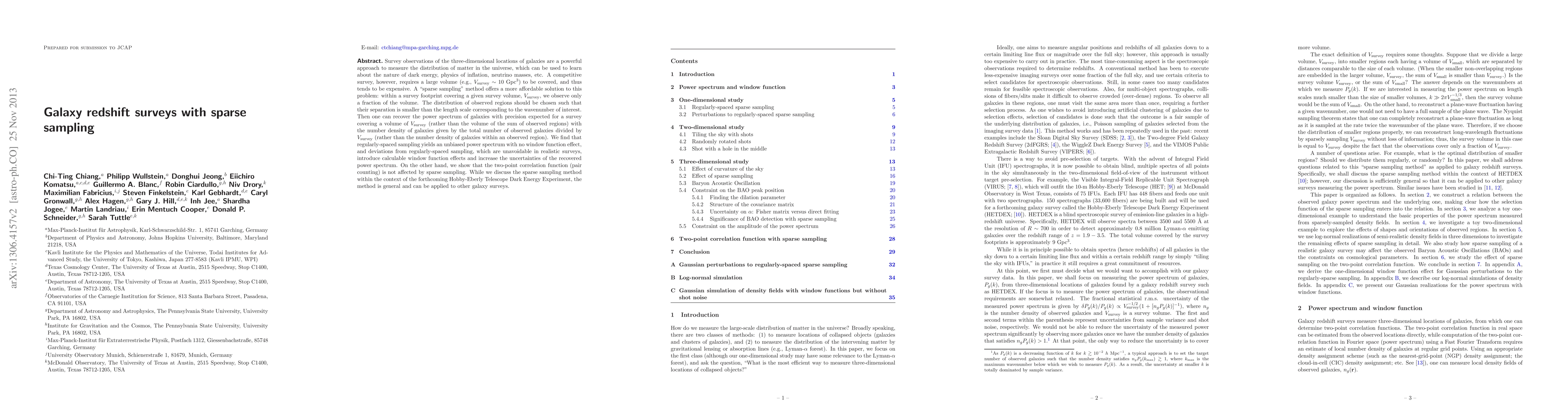 Survey observations of the three-dimensional locations of galaxies are a powerful approach to measure the distribution of matter in the universe, which can be used to learn about the nature of dark energy, physics of inflation, neutrino masses, etc. A competitive survey, however, requires a large volume (e.g., Vsurvey is roughly 10 Gpc3) to be covered, and thus tends to be expensive. A "sparse sampling" method offers a more affordable solution to this problem: within a survey footprint covering a given survey volume, Vsurvey, we observe only a fraction of the volume. The distribution of observed regions should be chosen such that their separation is smaller than the length scale corresponding to the wavenumber of interest. Then one can recover the power spectrum of galaxies with precision expected for a survey covering a volume of Vsurvey (rather than the volume of the sum of observed regions) with the number density of galaxies given by the total number of observed galaxies divided by Vsurvey (rather than the number density of galaxies within an observed region). We find that regularly-spaced sampling yields an unbiased power spectrum with no window function effect, and deviations from regularly-spaced sampling, which are unavoidable in realistic surveys, introduce calculable window function effects and increase the uncertainties of the recovered power spectrum. While we discuss the sparse sampling method within the context of the forthcoming Hobby-Eberly Telescope Dark Energy Experiment, the method is general and can be applied to other galaxy surveys.