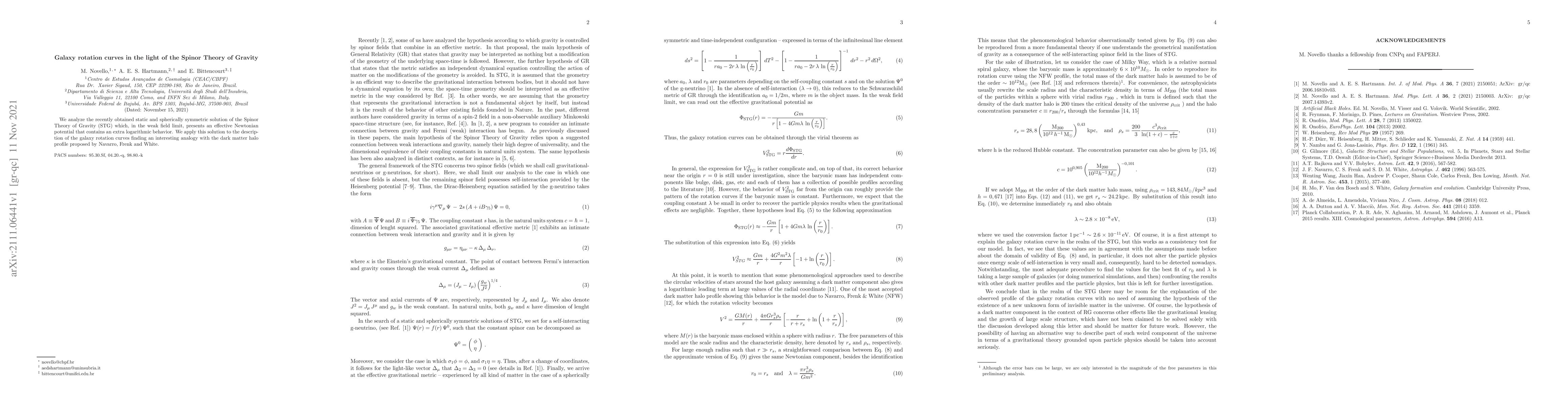 We analyze the recently obtained static and spherically symmetric solution of the Spinor Theory of Gravity (STG) which, in the weak field limit, presents an effective Newtonian potential that contains an extra logarithmic behavior. We apply this solution to the description of the galaxy rotation curves finding an interesting analogy with the dark matter halo profile proposed by Navarro, Frenk and White.