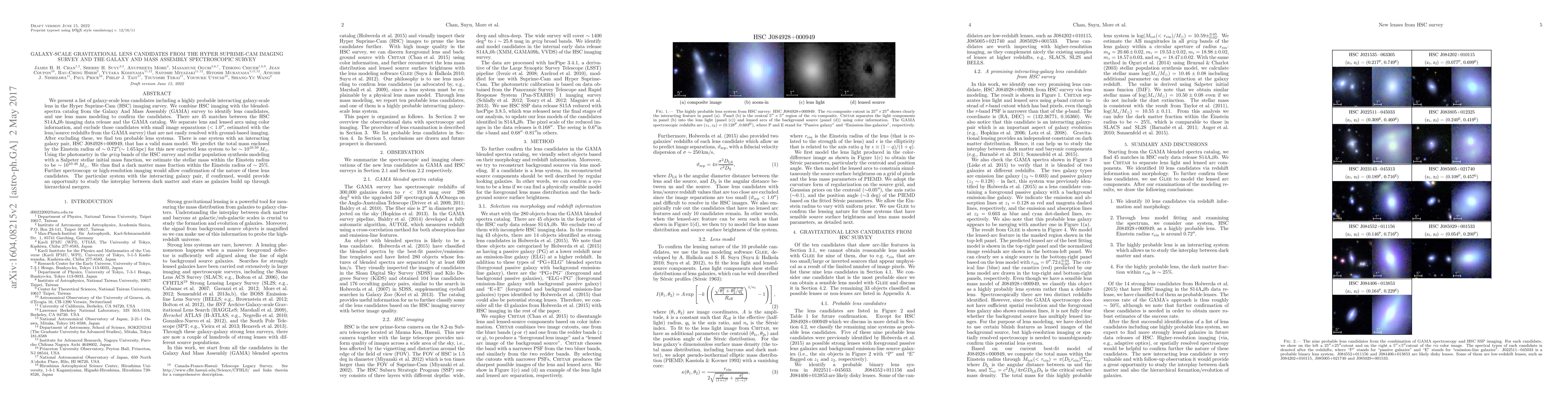 We present a list of galaxy-scale lens candidates including a highly probable interacting galaxy-scale lens in the Hyper Suprime-Cam (HSC) imaging survey. We combine HSC imaging with the blended-spectra catalog from the Galaxy And Mass Assembly (GAMA) survey to identify lens candidates, and use lens mass modeling to confirm the candidates. We find 46 matches between the HSC S14A_0b imaging data release and the GAMA catalog. Ten of them are probable lens systems according to their morphology and redshifts. There is one system with an interacting galaxy pair, HSC J084928+000949, that has a valid mass model. We predict the total mass enclosed by the Einstein radius of $\sim0.72$" ($\sim1.65$kpc) for this new expected lens system to be $\sim10^{10.59}M_{\odot}$. Using the photometry in the {\it grizy} bands of the HSC survey and stellar population synthesis modeling with a Salpeter stellar initial mass function, we estimate the stellar mass within the Einstein radius to be $\sim10^{10.46}\,M_{\odot}$. We thus find a dark matter mass fraction within the Einstein radius of $\sim25\%$. Further spectroscopy or high-resolution imaging would allow confirmation of the nature of these lens candidates. The particular system with the interacting galaxy pair, if confirmed, would provide an opportunity to study the interplay between dark matter and stars as galaxies build up through hierarchical mergers.