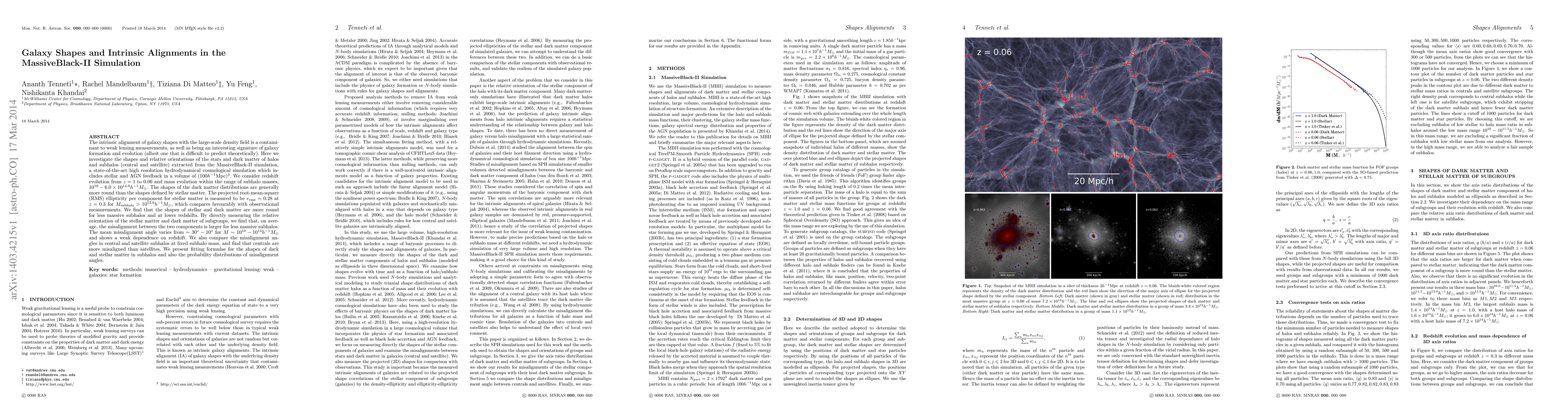 The intrinsic alignment of galaxy shapes with the large-scale density field is a contaminant to weak lensing measurements, as well as being an interesting signature of galaxy formation and evolution (albeit one that is difficult to predict theoretically). Here we investigate the shapes and relative orientations of the stars and dark matter of halos and subhalos (central and satellite) extracted from the MassiveBlack-II simulation, a state-of-the-art high resolution hydrodynamical cosmological simulation which includes stellar and AGN feedback in a volume of $(100{h^{-1}\mathrm{Mpc}})^3$. We consider redshift evolution from $z=1$ to $0.06$ and mass evolution within the range of subhalo masses, $10^{10} -6.0 \times 10^{14.0}{h^{-1}M_{\odot}}$. The shapes of the dark matter distributions are generally more round than the shapes defined by stellar matter. The projected root-mean-square (RMS) ellipticity per component for stellar matter is measured to be $e_\text{rms} = 0.28$ at $z=0.3$ for $M_{subhalo}> 10^{12.0}{h^{-1}M_{\odot}}$, which compares favourably with observational measurements. We find that the shapes of stellar and dark matter are more round for less massive subhalos and at lower redshifts. By directly measuring the relative orientation of the stellar matter and dark matter of subgroups, we find that, on average, the misalignment between the two components is larger for less massive subhalos. The mean misalignment angle varies from $\sim 30^{\circ}-10^{\circ}$ for $M \sim 10^{10} - 10^{14} {h^{-1}M_{\odot}}$ and shows a weak dependence on redshift. We also compare the misalignment angles in central and satellite subhalos at fixed subhalo mass, and find that centrals are more misaligned than satellites. We present fitting formulae for the shapes of dark and stellar matter in subhalos and also the probability distributions of misalignment angles.